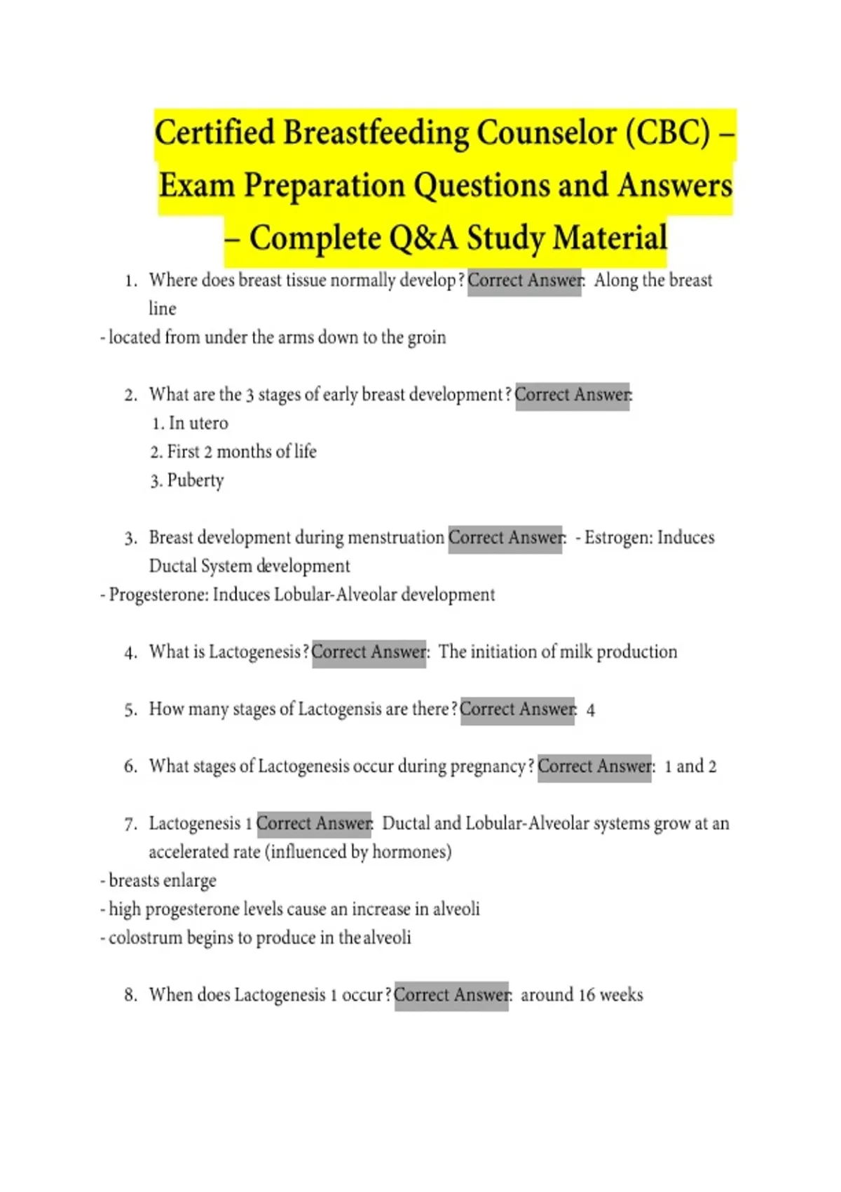 This document contains a comprehensive set of Certified Breastfeeding Counselor (CBC) exam questions and fully correct answers, covering key lactation counseling concepts and exam-relevant topics. It is designed to support exam preparation by reinforcing theoretical knowledge and practical application. The material is suitable for self-study and last-minute review before the CBC certification exam.