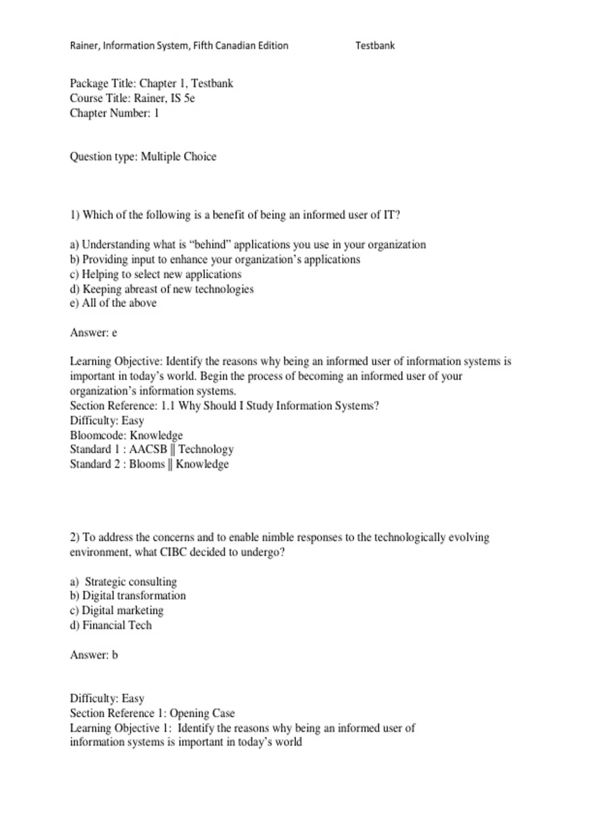 Rainer, Information System, Fifth Canadian Edition Testbank