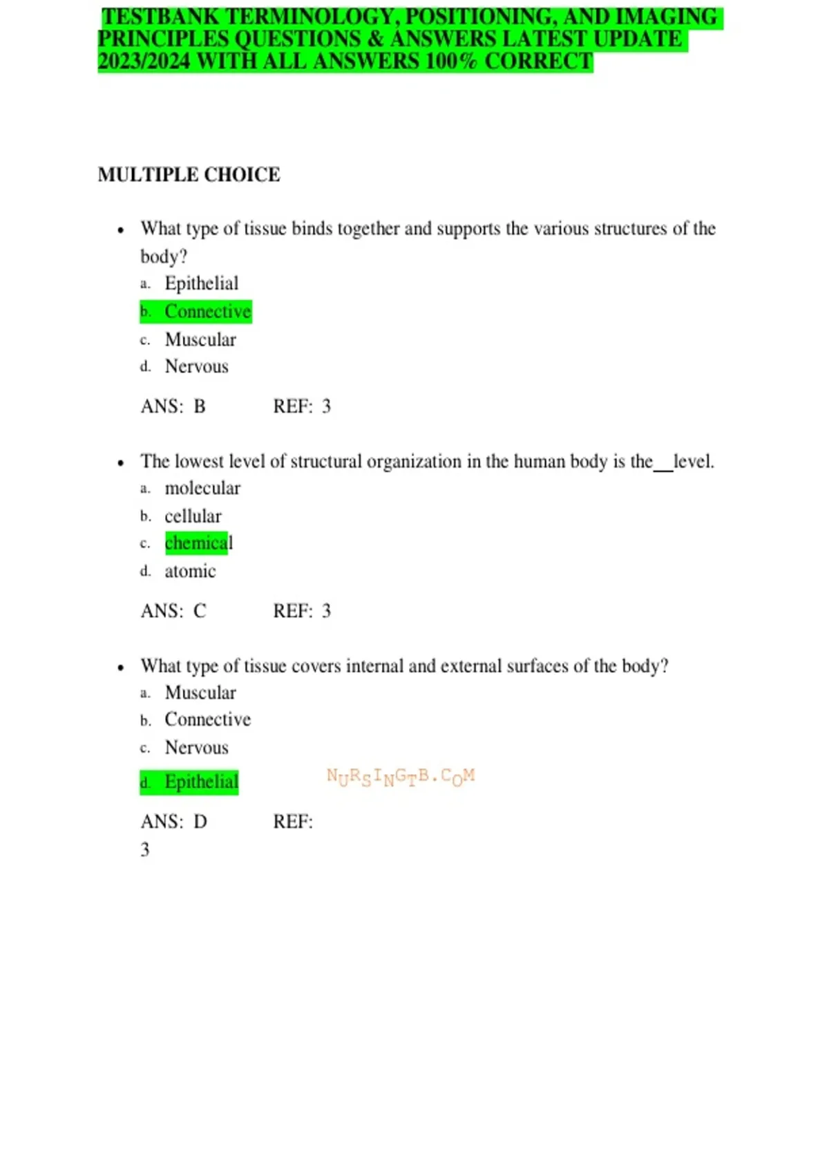 This Test Bank for Terminology, Positioning, and Imaging Principles provides a comprehensive collection of questions and answers, fully updated for 2023/2024. Covering all major topics in medical imaging, radiography, and positioning techniques, it includes multiple-choice questions, short-answer problems, and practical case scenarios with 100% verified answers. Structured to reinforce learning, the test bank aids students in understanding complex terminology, proper patient positioning, and imaging principles critical to accurate diagnostics. Ideal for classroom review, exam preparation, and self-study, it helps learners practice effectively, retain knowledge, and achieve high scores in tests and assessments. With clear organization and complete coverage, this resource is essential for radiography students, healthcare professionals, and anyone preparing for imaging and radiologic exams.
