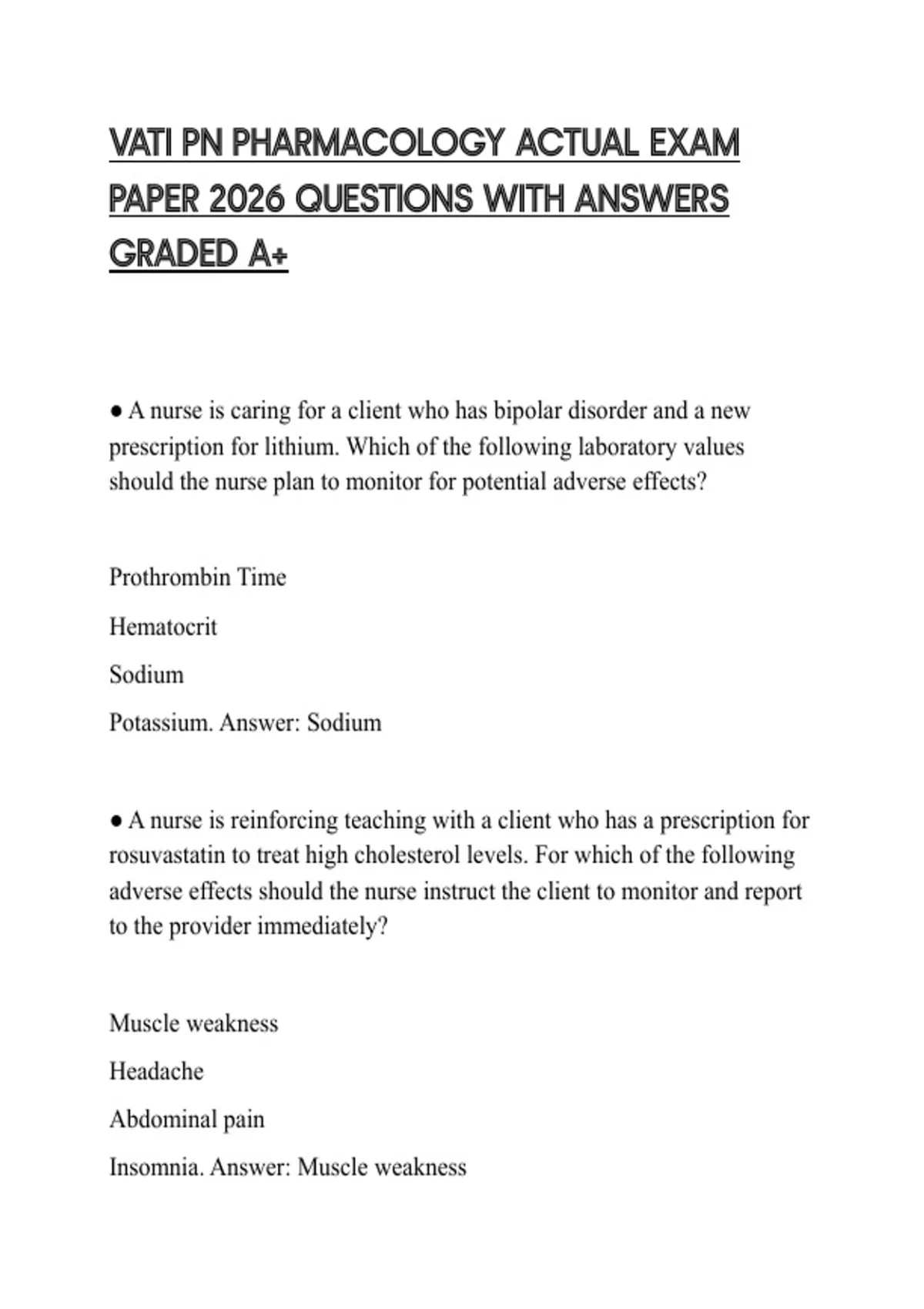 VATI PN PHARMACOLOGY ACTUAL EXAM PAPER 2026 QUESTIONS WITH ANSWERS GRADED A+