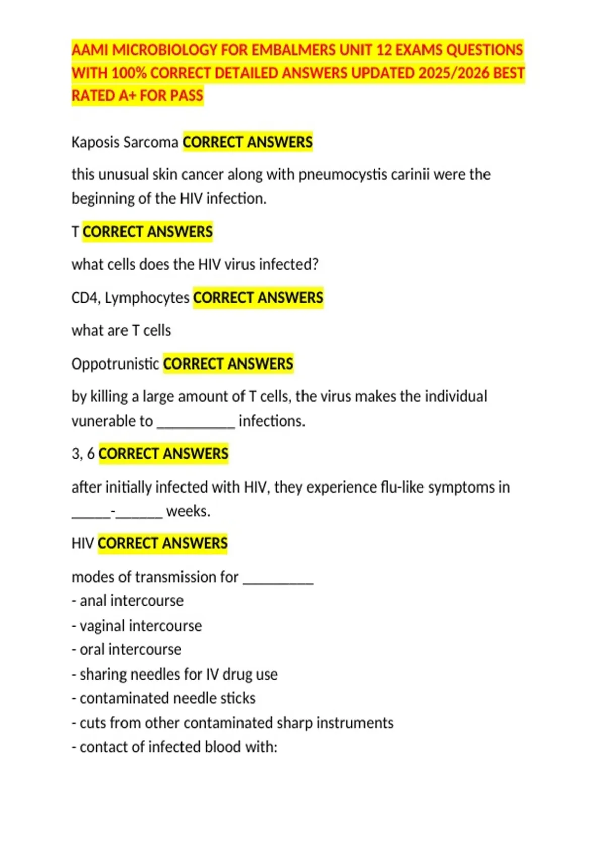 AAMI MICROBIOLOGY FOR EMBALMERS UNIT 12 EXAMS QUESTIONS