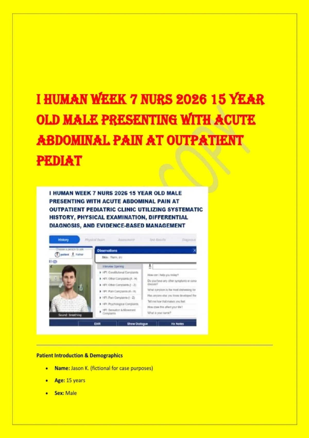 I HUMAN WEEK 7 NURS 2026 15 YEAR OLD MALE PRESENTING WITH ACUTE ABDOMINAL PAIN AT OUTPATIENT PEDIAT