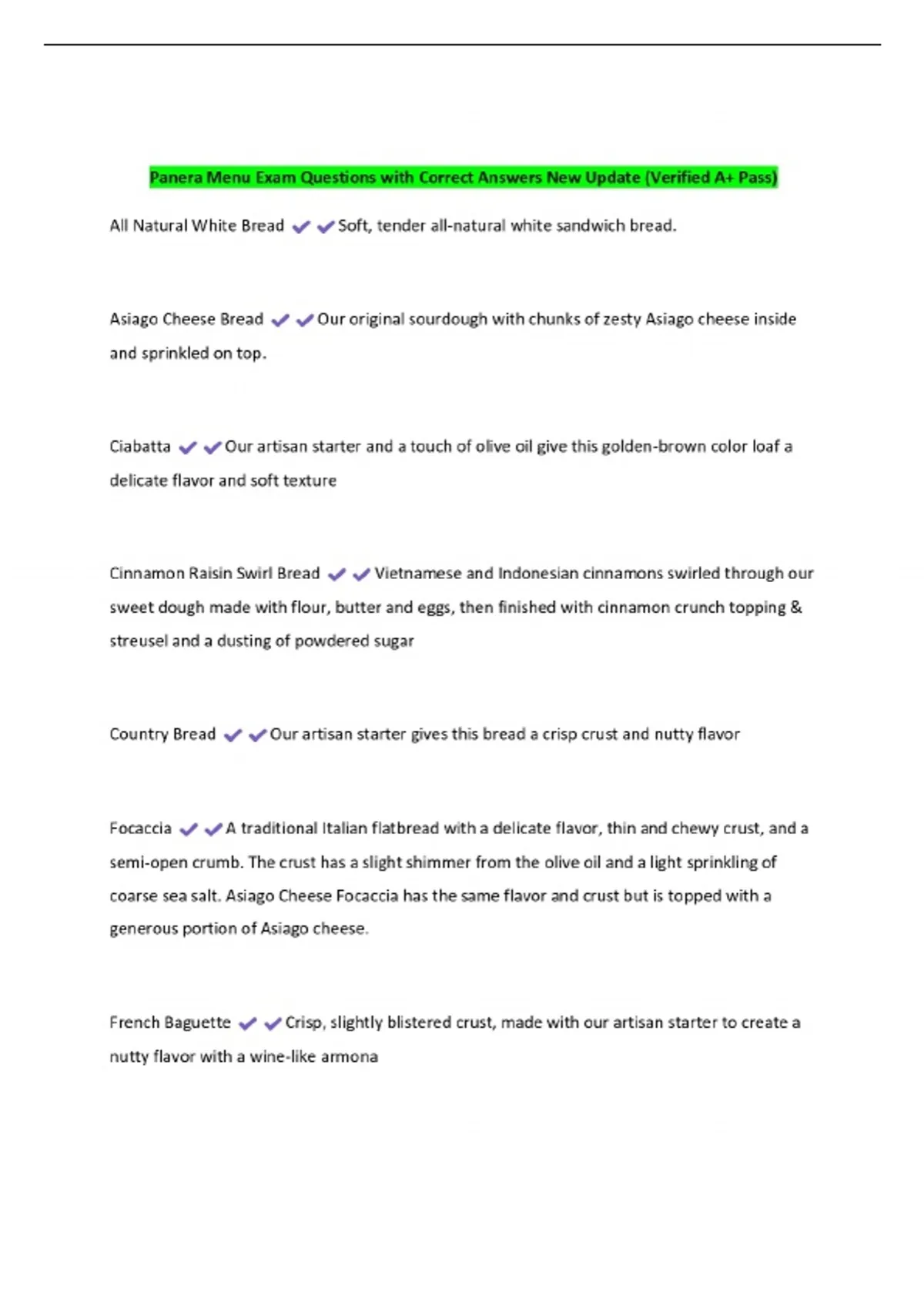 Panera Menu Exam Questions with Correct Answers New Update (Verified A+ Pass)