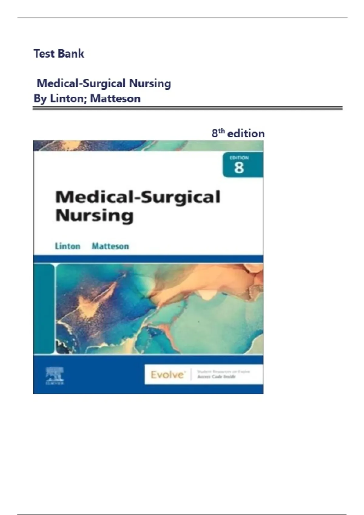 This complete test bank for Medical-Surgical Nursing, 8th Edition by Adrianne Dill Linton & Mary Ann Matteson provides comprehensive, chapter-by-chapter practice questions with accurate answers to help nursing students master adult health and med-surg concepts. It covers patient assessment, pathophysiology, nursing interventions, clinical decision-making, and evidence-based care for a variety of acute and chronic conditions. Ideal for undergraduate nursing programs, RN courses, NCLEX preparation, exams, quizzes, and clinical review, fully updated for 2025/2026 academic use.