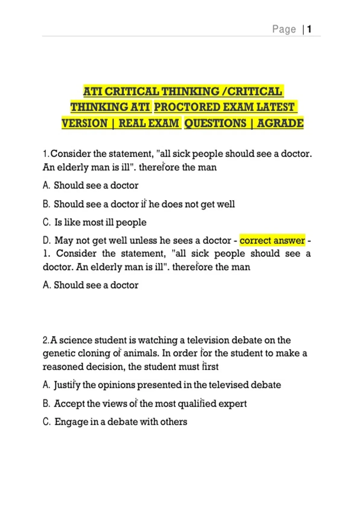 ATI CRITICAL THINKING /CRITICAL THINKING ATI PROCTORED EXAM LATEST VERSION | REAL EXAM QUESTIONS | AGRADE