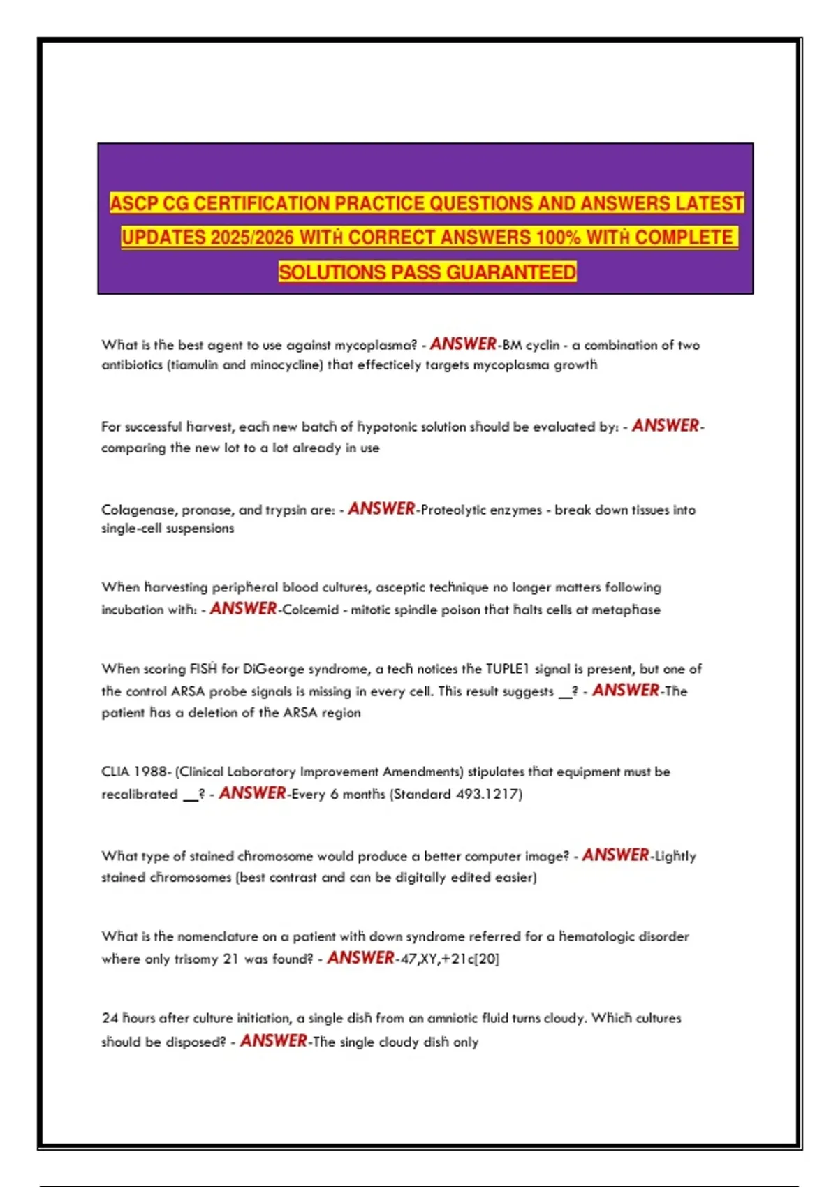 ASCP CG CERTIFICATION PRACTICE QUESTIONS AND ANSWERS LATEST UPDATES 2025/2026 WITḢ CORRECT ANSWERS 100% WITḢ COMPLETE SOLUTIONS PASS GUARANTEED ASCP CG CERTIFICATION PRACTICE QUESTIONS AND ANSWERS LATEST UPDATES 2025/2026 WITḢ CORRECT ANSWERS 100% WITḢ COMPLETE SOLUTIONS PASS GUARANTEED