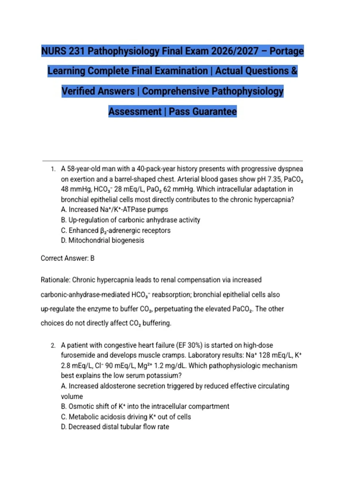 NURS 231 Pathophysiology Final Exam 2026/2027 – Portage Learning Complete Final Examination | Actual Questions & Verified Answers | Comprehensive Pathophysiology Assessment | Pass Guarantee