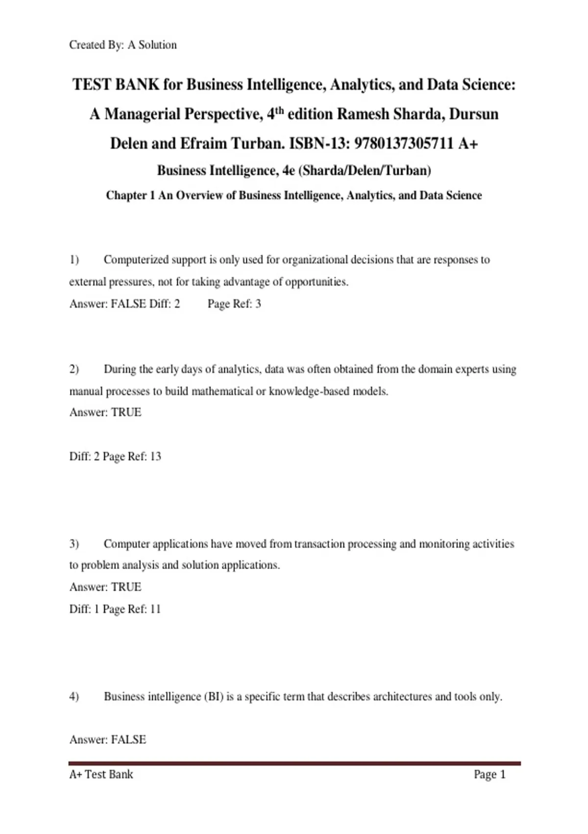 This test bank for Business Intelligence, Analytics, and Data Science: A Managerial Perspective, 4th Edition by Ramesh Sharda, Dursun Delen, and Efraim Turban provides comprehensive coverage of key concepts used in modern data-driven decision making. It includes exam-style questions and answers covering business intelligence foundations, data analytics, data science methods, data warehousing, data mining, predictive analytics, big data, visualization, and managerial applications. Designed to support coursework, exams, and self-study, the test bank helps students understand how analytical tools and technologies are applied in real business environments. The questions reinforce theoretical understanding while improving practical analytical thinking. Ideal for students in business analytics, information systems, data science, and management programs, this resource supports effective revision, exam preparation, and deeper comprehension of analytics-driven business strategies.