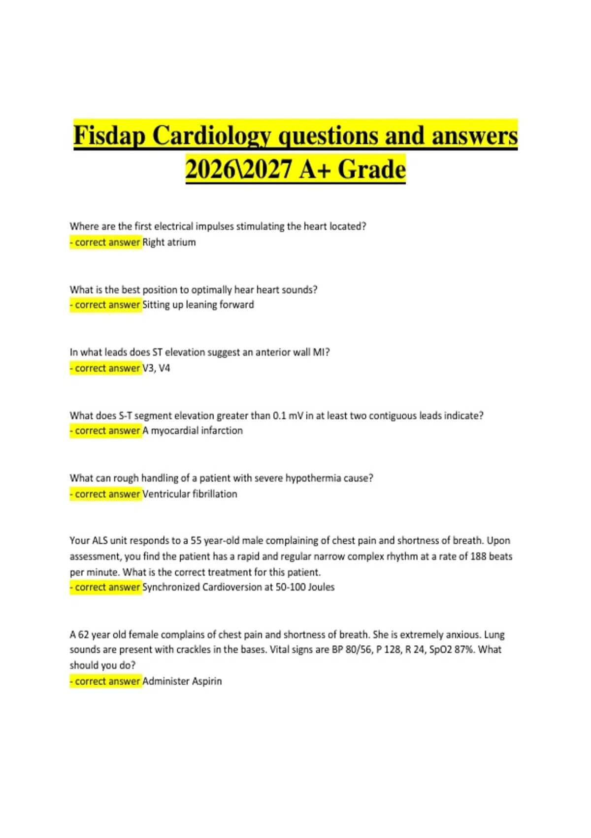 This document provides the verified questions and correct answers for the FISDAP Cardiology Exam for the 2026/2027 academic year. It covers critical cardiac topics including ECG interpretation, arrhythmia recognition, myocardial infarction management, heart failure, cardiac arrest protocols, and emergency interventions. Perfect for EMT and paramedic students preparing for FISDAP cardiology assessments, offering accurate, up-to-date material for achieving an A+ grade.