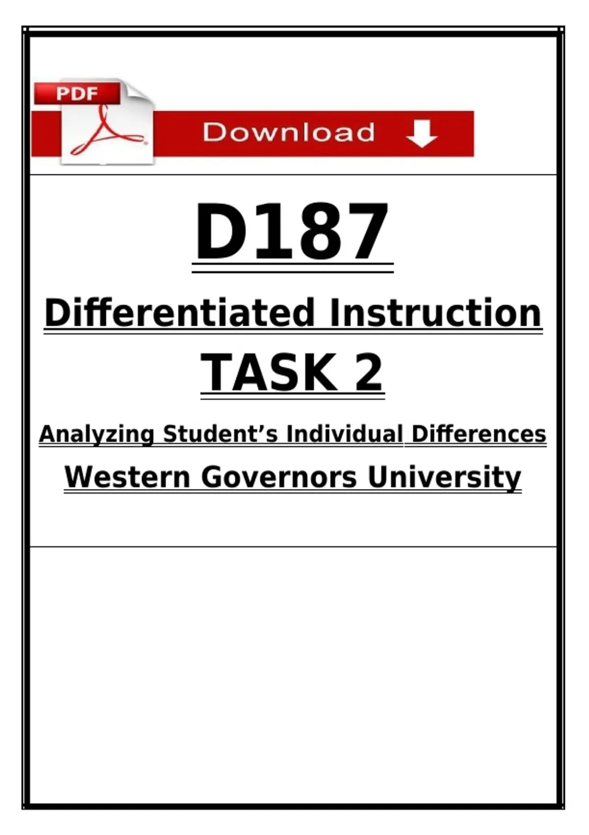INSTANT PDF DOWNLOAD This document is a PASSED WGU D187 Task 2 (2026) submission for Differentiated Instruction. It focuses on Analyzing Student’s Individual Differences and is fully aligned with WGU rubric standards. Ideal as a reference, exemplar, or study aid to understand expectations, structure, and depth required to pass on the first submission. WGU D187 Task 2, D187 Differentiated Instruction, WGU Task 2 Passed, Analyzing Student Differences, WGU Education Tasks, D187 Performance Assessment, WGU Teaching Degree, Differentiated Instruction WGU, Individual Differences Analysis, WGU Coursework Help, D187 Sample Paper, WGU Task Examples, WGU Education Major, D187 Study Guide, WGU PDF Download, Western Governors University D187, WGU Assignment Help, WGU Pass Task 2
