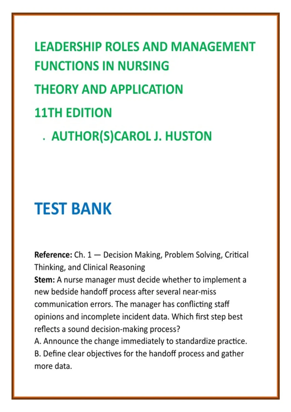 Nursing Leadership & Management Test Bank 2026 | Huston 11th Ed | Leadership Roles & Management Functions MCQs Description (200–300 words) Master nursing leadership, management, and administrative decision-making with this comprehensive Nursing Leadership & Management Test Bank aligned to Leadership Roles and Management Functions in Nursing: Theory and Application (11th Edition) by Carol J. Huston—one of the most trusted and widely adopted texts in nursing leadership education. This full-coverage digital test bank includes 50 NCLEX-style multiple-choice questions (MCQs) per chapter, spanning all units and chapters of the textbook. Every question is built around realistic nurse leader, charge nurse, and nurse manager scenarios, emphasizing clinical judgment, systems thinking, and evidence-based management—not rote memorization. Each MCQ includes a verified correct answer with a detailed, evidence-based rationale, helping learners understand why a leadership decision is correct and why alternatives are less effective, unsafe, or unethical. Content focuses heavily on delegation and prioritization, staffing and workforce management, conflict resolution, communication, ethical and legal decision-making, quality improvement, and patient safety leadership. What’s Included Full textbook coverage — all units & chapters 50 NCLEX-style MCQs per chapter In-depth rationales grounded in leadership and management theory Scenario-based questions reflecting real healthcare organizations Ideal for exam prep, quizzes, midterms, finals, and self-study Ideal For Courses In Nursing Leadership & Management Nursing Administration Professional Nursing Practice Healthcare Systems & Policy RN-to-BSN & BSN Capstone Leadership MSN Leadership & Management Foundations Designed to save study time, build confidence, and strengthen leadership-level clinical judgment, this test bank prepares students not just to pass exams—but to lead effectively in modern healthcare systems. Keywords (8 High-Value SEO Phrases) nursing leadership test bank nursing management test bank 2026 Huston leadership nursing test bank leadership roles and management functions test bank nursing management MCQs nursing administration exam questions RN to BSN leadership test bank MSN leadership management study guide Hashtags (10 Total) #NursingLeadership #NursingManagement #NursingTestBank #HustonNursing #RNtoBSN #MSNLeadership #NursingAdministration #NursingEducation #NCLEXStyleQuestions #NursingStudents