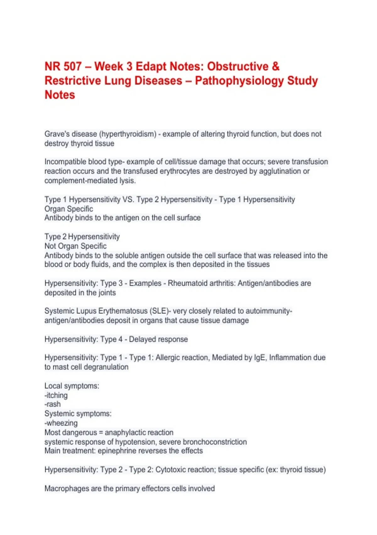 This document covers Week 3 Edapt notes for NR 507, focusing on the pathophysiology of obstructive and restrictive lung diseases. It explains disease mechanisms, functional changes in the respiratory system, and key differences between obstructive and restrictive pulmonary disorders, making it useful for exam preparation and concept review.