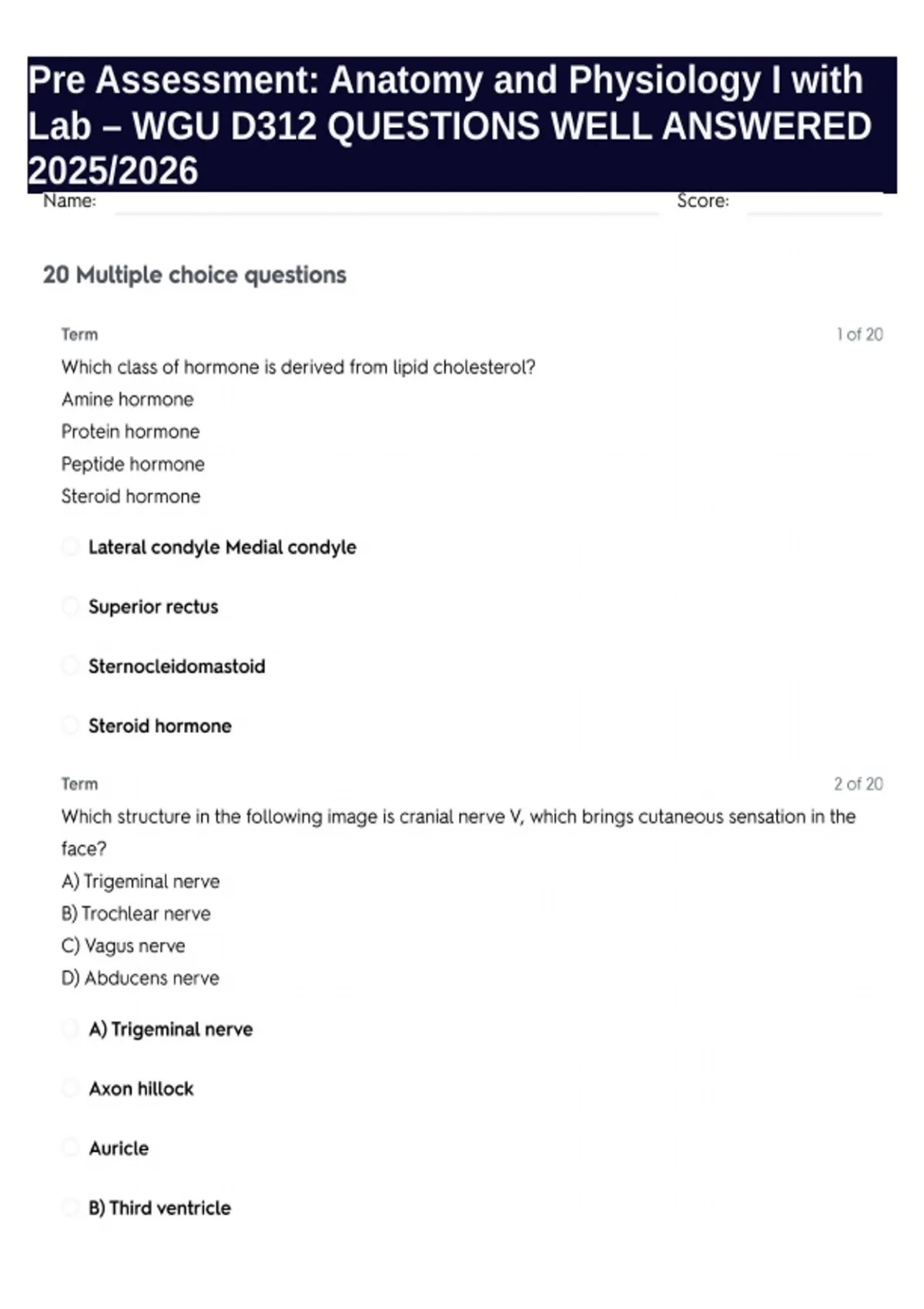 Pre Assessment: Anatomy and Physiology I with Lab – WGU D312 QUESTIONS WELL ANSWERED 2025/2026