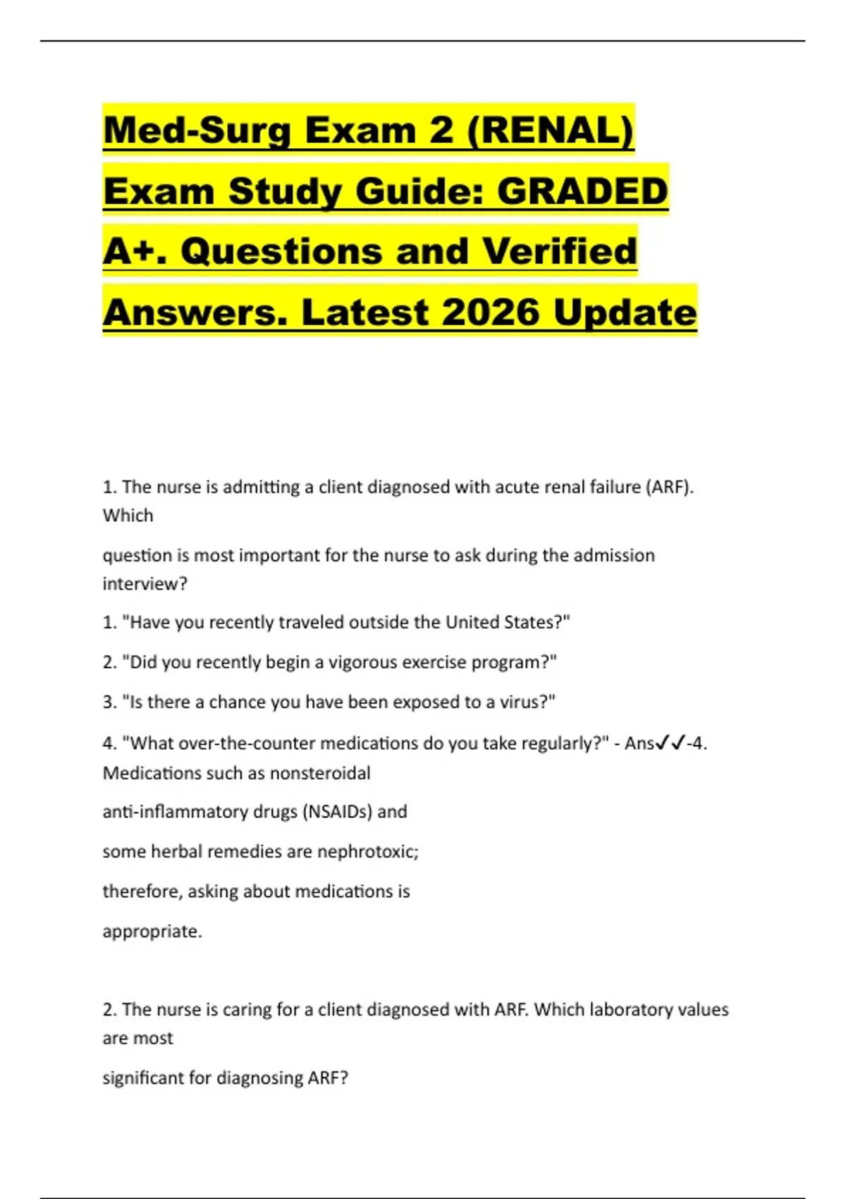 Med-Surg Exam 2 (RENAL) Exam Study Guide: GRADED A+. Questions and Verified Answers. Latest 2026 Update Med-Surg Exam 2 (RENAL) Exam Study Guide: GRADED A+. Questions and Verified Answers. Latest 2026 Update Med-Surg Exam 2 (RENAL) Exam Study Guide: GRADED A+. Questions and Verified Answers. Latest 2026 Update Med-Surg Exam 2 (RENAL) Exam Study Guide: GRADED A+. Questions and Verified Answers. Latest 2026 Update