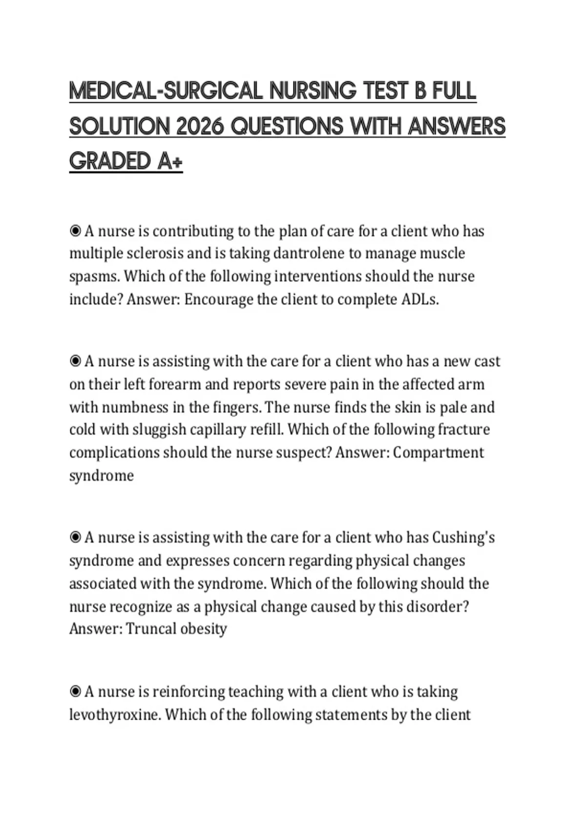 MEDICAL-SURGICAL NURSING TEST B FULL SOLUTION 2026 QUESTIONS WITH ANSWERS GRADED A+