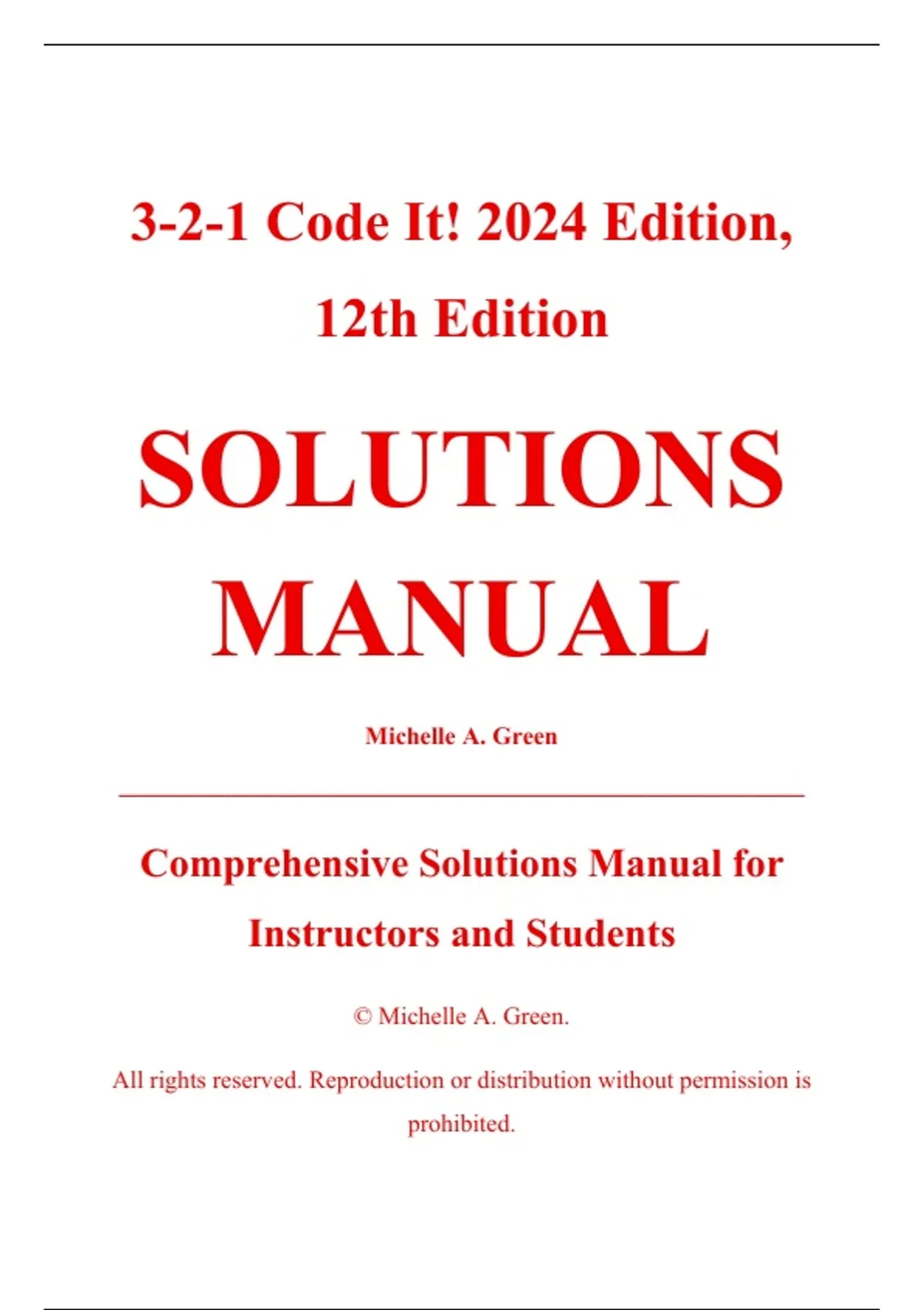 Solutions Manual — 3‑2‑1 Code It! 2024 Edition, 12th Edition — Michelle A. Green — ISBN 9780357932209 — Latest Update 2025/2026 — (All Chapters Covered 1–20). Chapters Include: Chapter 1: Overview of Coding, followed by Chapter 2: Introduction to ICD‑10‑CM Coding and Conventions, Chapter 3: Chapter‑Specific Coding Guidelines: ICD‑10‑CM Chapters 1–10, Chapter 4: Chapter‑Specific Coding Guidelines: ICD‑10‑CM Chapters 11–22, Chapter 5: ICD‑10‑CM Outpatient and Physician Office Coding, Chapter 6: Introduction to ICD‑10‑PCS Coding, Conventions, and Section Coding Guidelines, Chapter 7: ICD‑10‑CM and ICD‑10‑PCS Inpatient Hospital Coding, Chapter 8: HCPCS Level II Coding System, Chapter 9: Introduction to CPT Coding, Chapter 10: CPT Evaluation and Management, Chapter 11: CPT Anesthesia, Chapter 12: CPT Surgery I, Chapter 13: CPT Surgery II, Chapter 14: CPT Surgery III, Chapter 15: CPT Surgery IV, Chapter 16: CPT Surgery V, Chapter 17: CPT Radiology, Chapter 18: CPT Pathology and Laboratory, Chapter 19: CPT Medicine, and Chapter 20: Insurance and Reimbursement Overview.