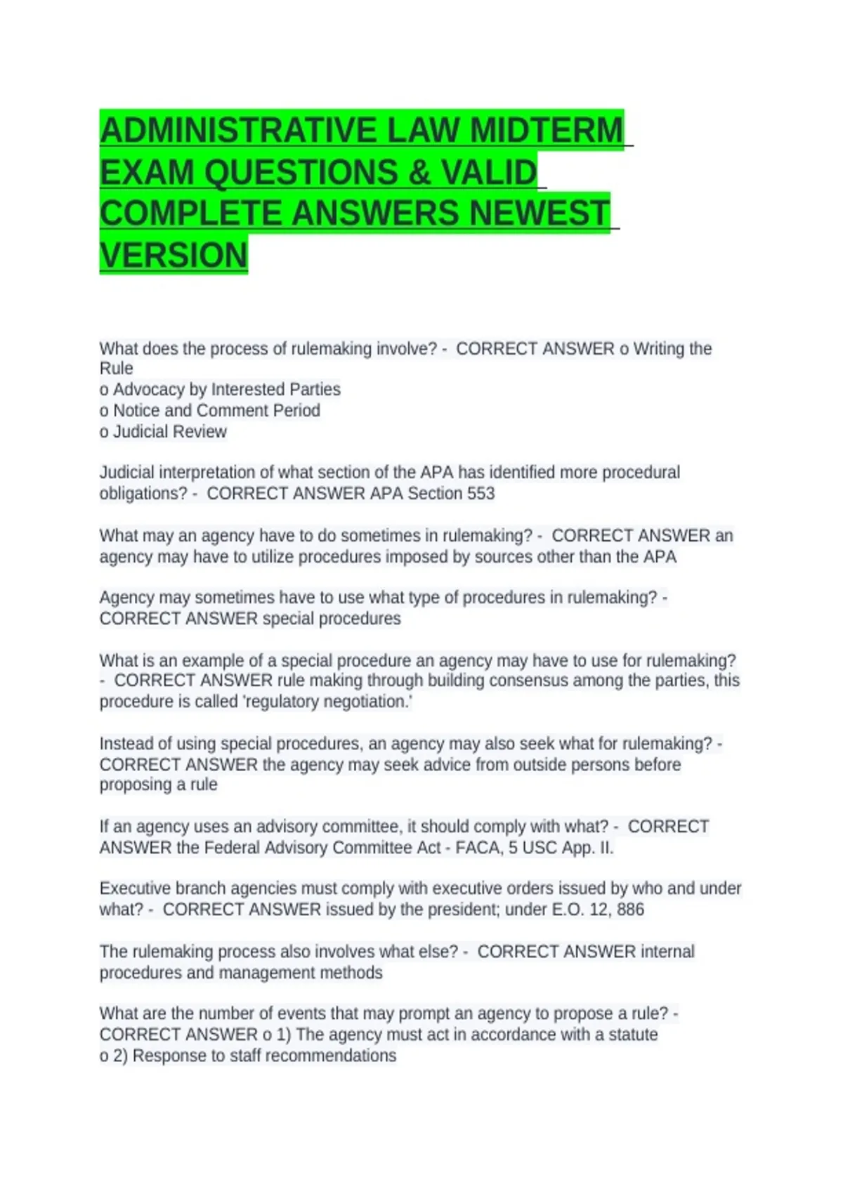 ADMINISTRATIVE LAW MIDTERM EXAM QUESTIONS & VALID COMPLETE ANSWERS NEWEST VERSION focuses on how government agencies are created, how they operate, and how their decisions are made and reviewed. The course examines the legal principles that control the powers, procedures, and accountability of administrative bodies at the local, national, or federal level.