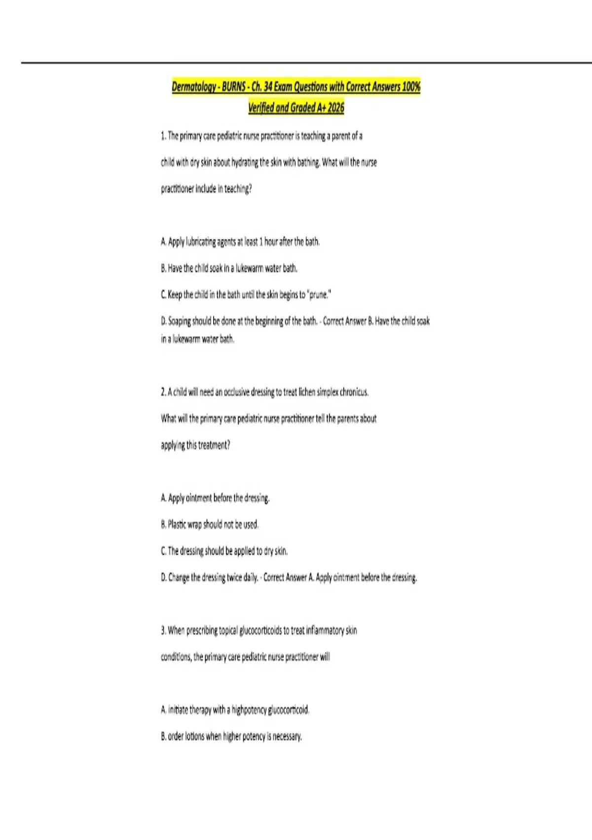 Dermatology - BURNS - Ch. 34 Exam Questions with Correct Answers 100% Verified and Graded A+ 2026 1. The primary care pediatric nurse practitioner is teaching a parent of a child with dry skin about hydrating the skin with bathing. What will the nurse practitioner include in teaching? A. Apply lubricating agents at least 1 hour after the bath. B. Have the child soak in a lukewarm water bath. C. Keep the child in the bath until the skin begins to "prune." D. Soaping should be done at the beginning of the bath. - Correct Answer B. Have the child soak in a lukewarm water bath. 2. A child will need an occlusive dressing to treat lichen simplex chronicus. What will the primary care pediatric nurse practitioner tell the parents about applying this treatment? A. Apply ointment before the dressing. B. Plastic wrap should not be used. C. The dressing should be applied to dry skin. D. Change the dressing twice daily. - Correct Answer A. Apply ointment before the dressing. 3. When prescribing topical glucocorticoids to treat inflammatory skin conditions, the primary care pediatric nurse practitioner will A. initiate therapy with a highpotency glucocorticoid. B. order lotions when higher potency is necessary.