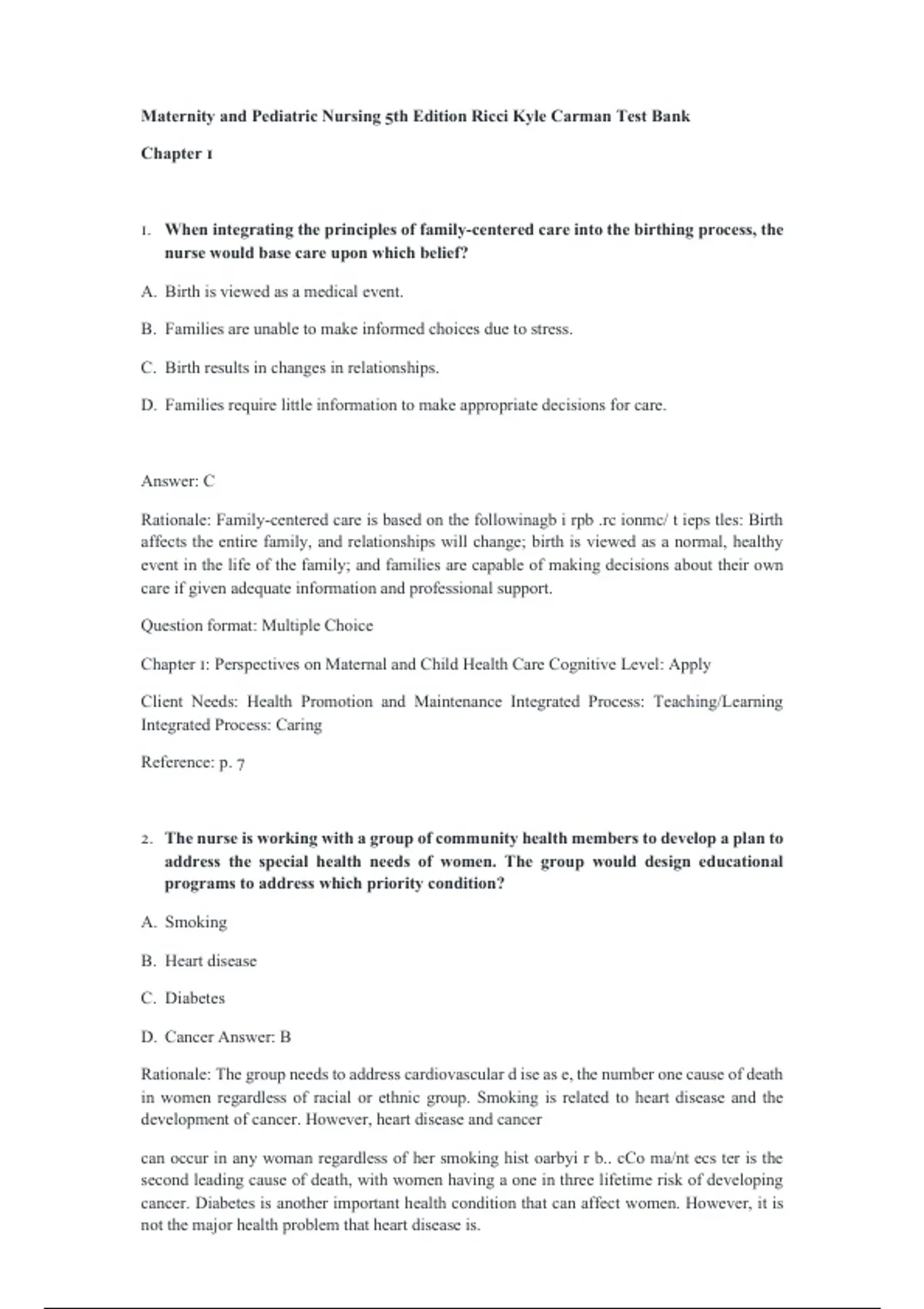 This 2026/2027 Test Bank for Maternity and Pediatric Nursing, 5th Edition by Ricci, Kyle, and Carman provides students with comprehensive chapter-based questions for maternal and child health nursing courses. The test bank emphasizes clinical decision-making, patient-centered care, and pediatric and maternity care principles, supporting exam preparation, skill development, and confidence in practical nursing application.
