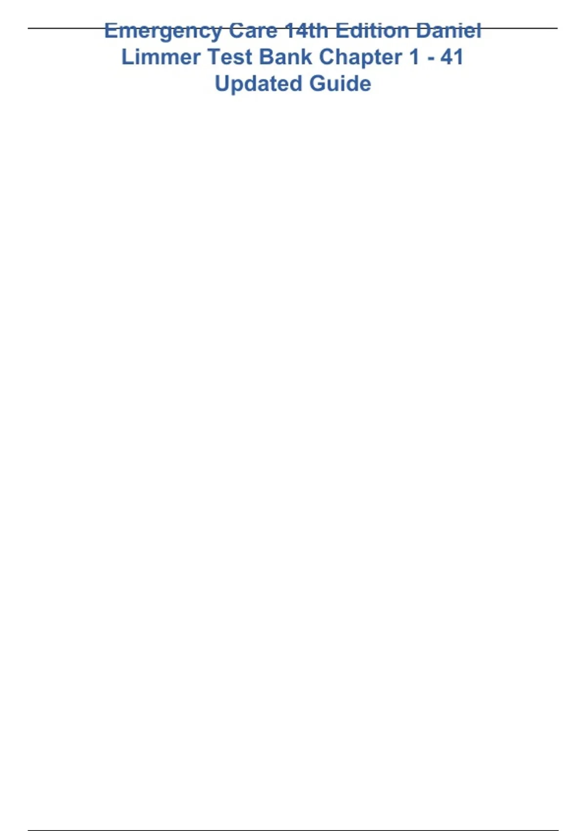 This 2026/2027 Test Bank for Emergency Care, 14th Edition by Daniel Limmer provides a complete set of updated chapter-based questions covering all 41 chapters. Designed for EMS and prehospital students, the test bank emphasizes patient assessment, emergency interventions, and clinical decision-making. Ideal for exam preparation, skill reinforcement, and full coverage of emergency care principles in both classroom and field practice.
