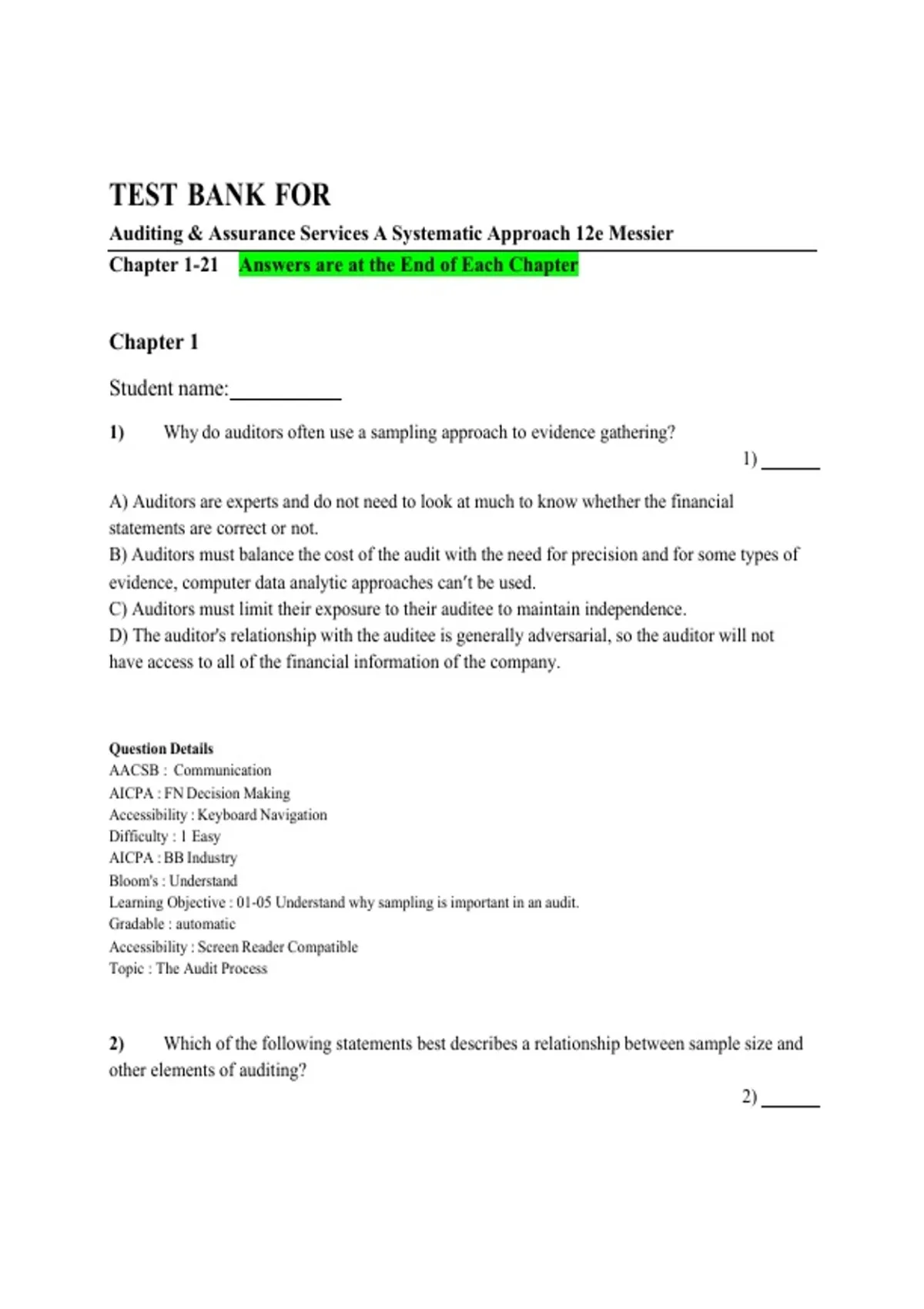 This 2026–2027 Test Bank for Auditing & Assurance Services, 12th Edition by Messier provides comprehensive chapter-based questions covering auditing principles, assurance standards, and financial reporting procedures. Designed for accounting students and professionals, the test bank emphasizes critical thinking, audit application, and exam readiness, supporting mastery of auditing concepts and practical problem-solving across all chapters.