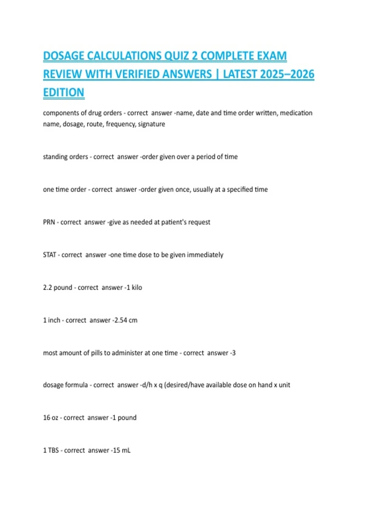 DOSAGE CALCULATIONS QUIZ 2 COMPLETE EXAM