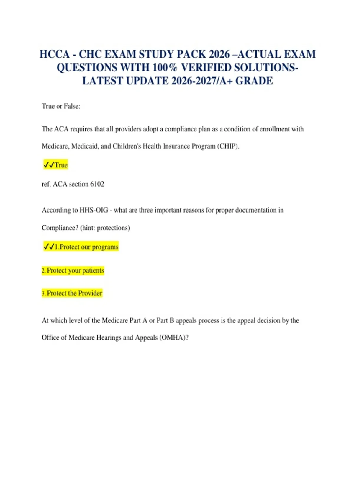 HCCA - CHC EXAM STUDY PACK 2026 –ACTUAL EXAM QUESTIONS WITH 100% VERIFIED SOLUTIONSLATEST UPDATE /A+ GRADE