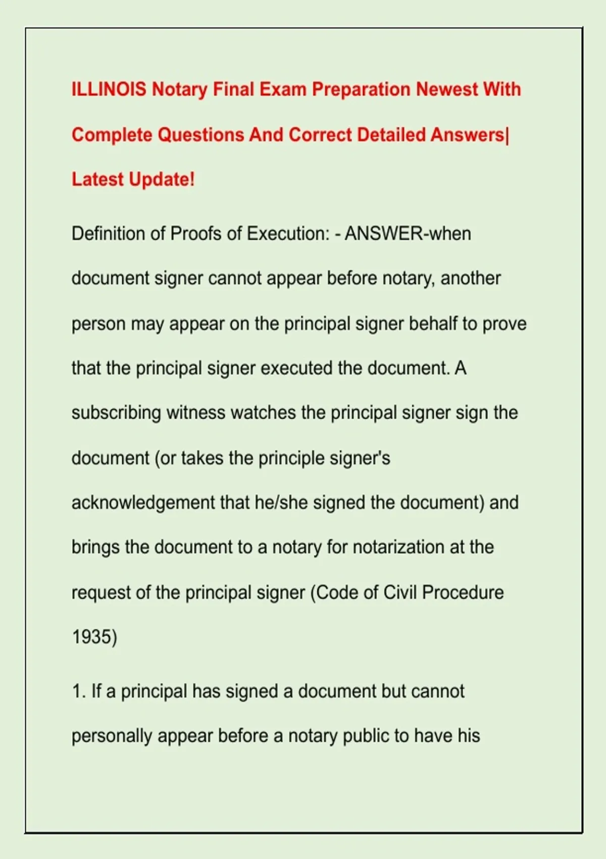 ILLINOIS Notary Final Exam Preparation Newest With Complete Questions And Correct Detailed Answers| Latest Update!