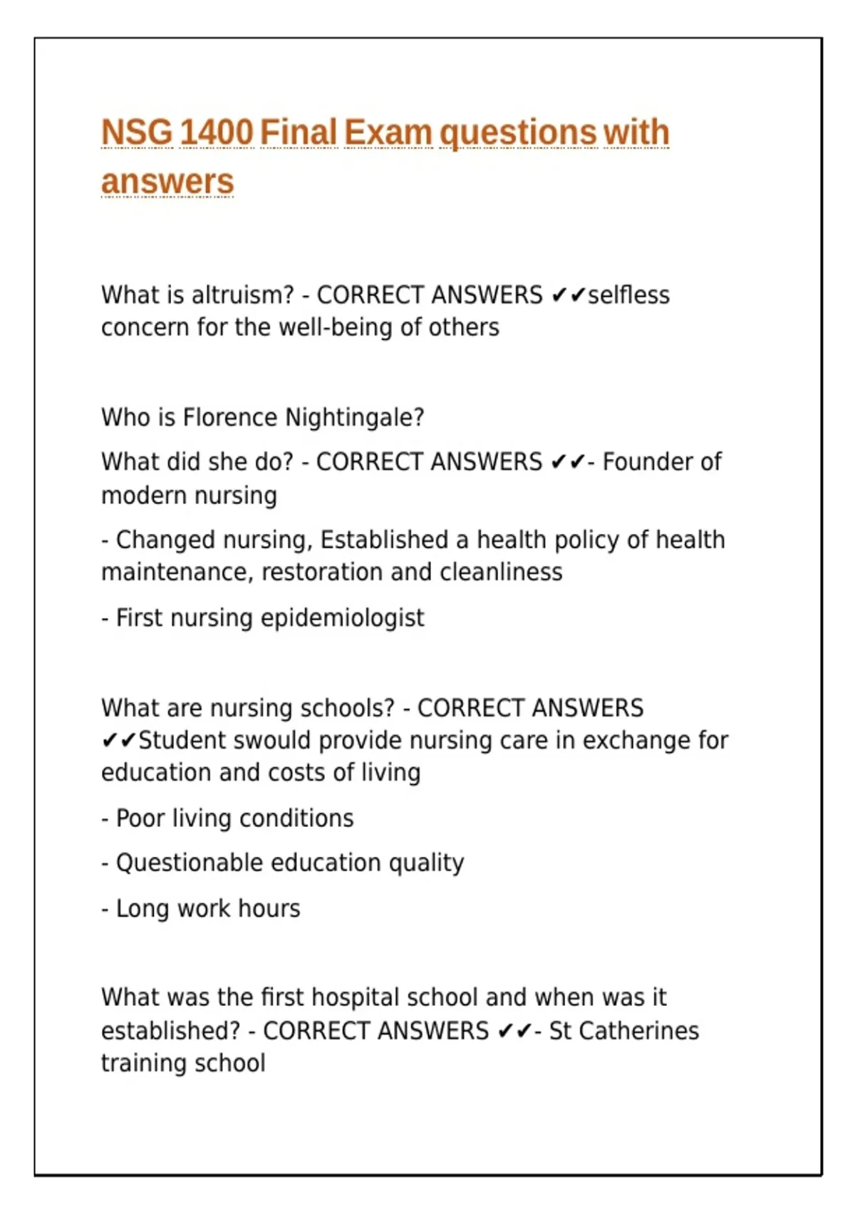 NSG 1400 Final Exam questions with