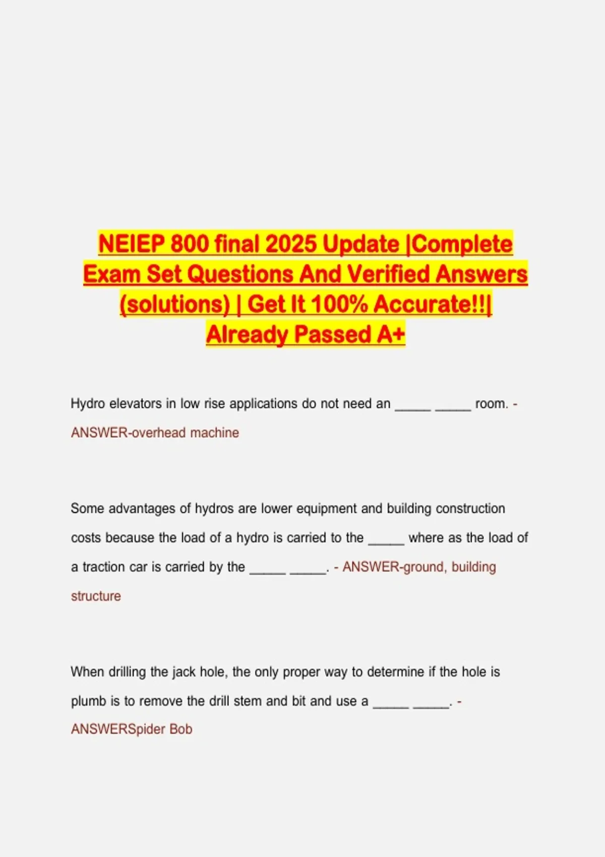 Download the complete NEIEP 800 Final 2025 Update exam set with verified answers and solutions. Includes hydraulic elevators, escalators, moving walks, LULA, chairlifts, and safety codes. Guaranteed accuracy.