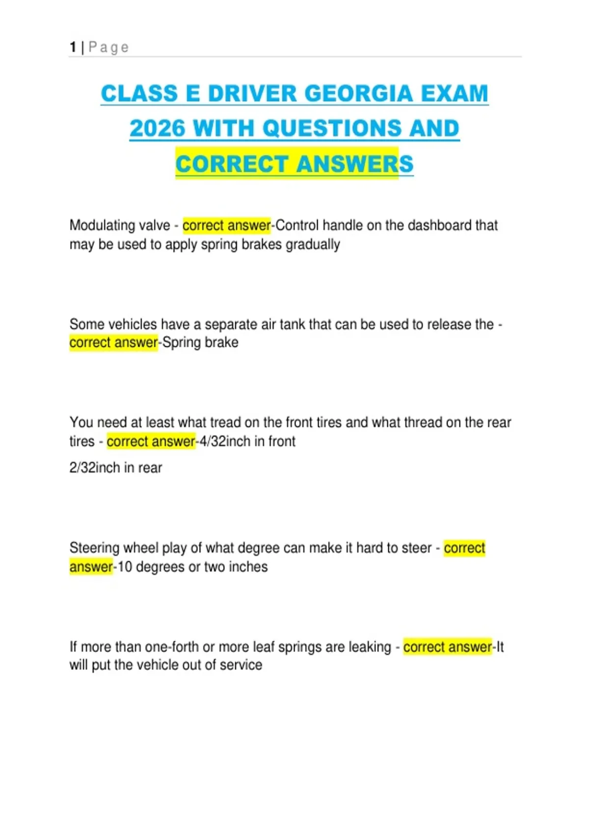 CLASS E DRIVER GEORGIA EXAM 2026 WITH QUESTIONS AND CORRECT ANSWERS