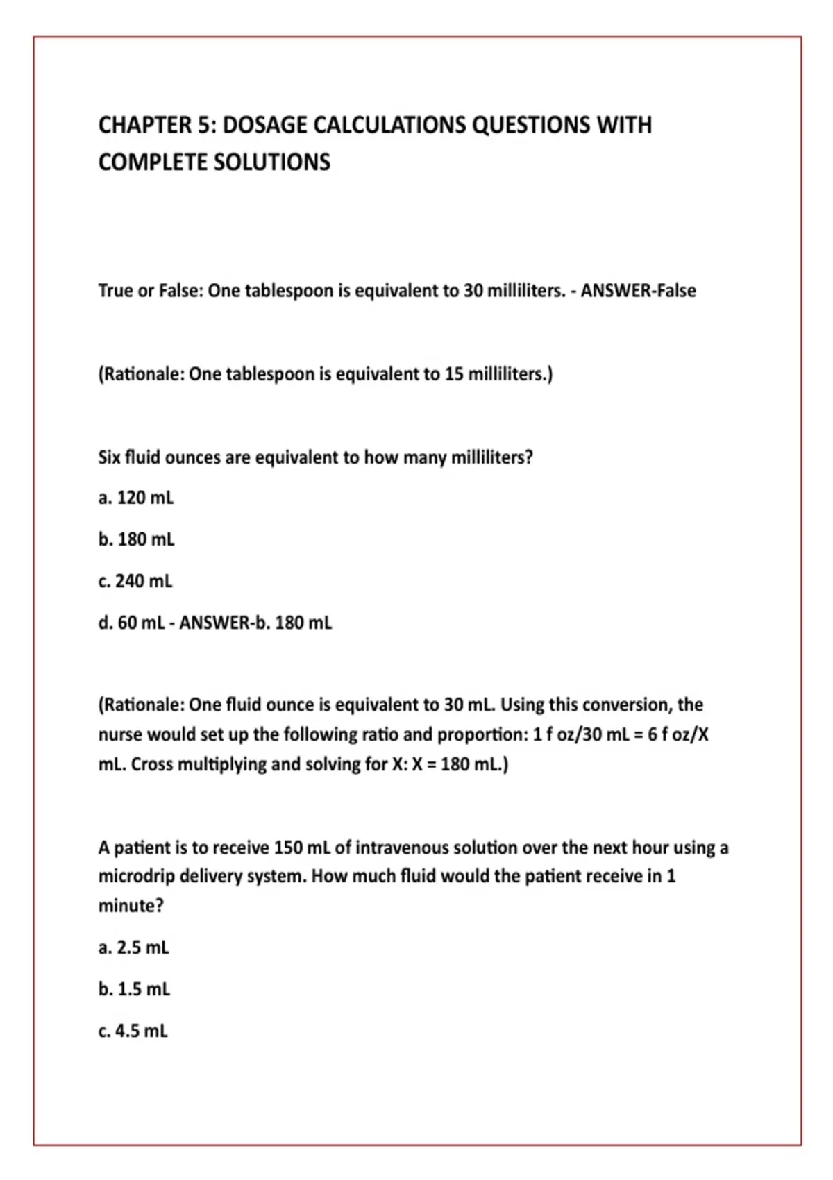 CHAPTER 5: DOSAGE CALCULATIONS QUESTIONS WITH COMPLETE SOLUTIONS