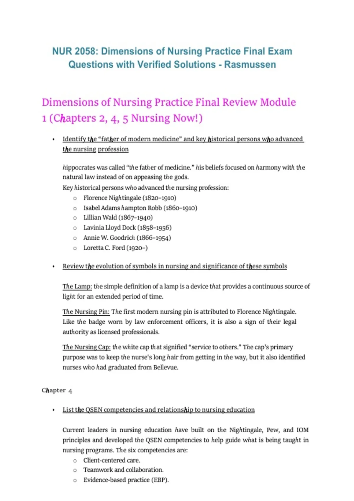 This document provides the final exam questions for NUR 2058 Dimensions of Nursing Practice at Rasmussen University, along with fully verified solutions for the 2026/2027 curriculum. It covers essential topics including nursing history, professional roles, nursing theories, leadership and management, ethical and legal principles, communication, teamwork, patient advocacy, and the impact of nursing leaders on contemporary practice.