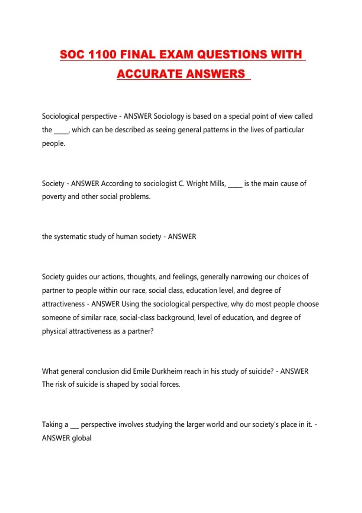 SOC 1100 FINAL EXAM QUESTIONS WITH