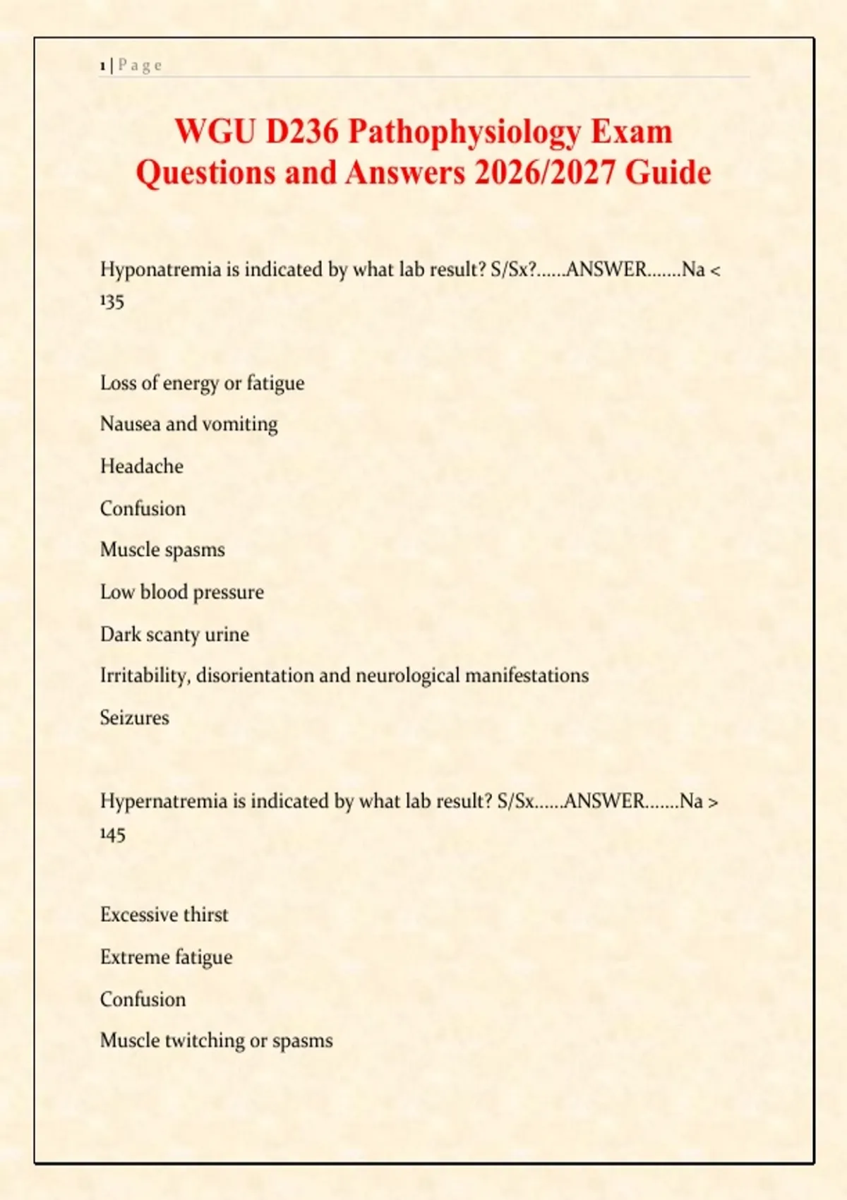 Hyponatremia is indicated by what lab result? S/Sx?......ANSWER.......Na <