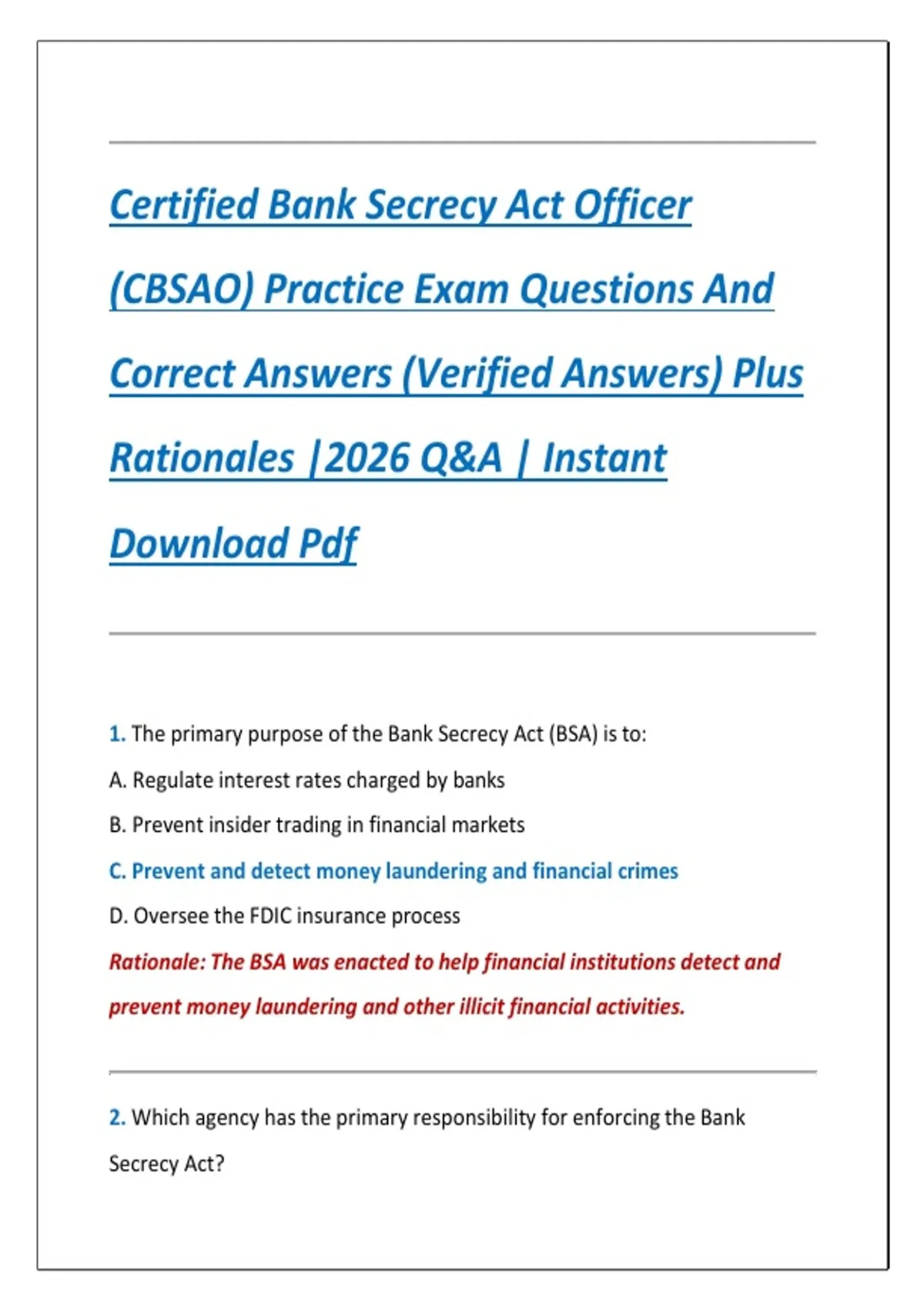 Certified Bank Secrecy Act Officer (CBSAO) Practice Exam Questions And Correct Answers (Verified Answers) Plus Rationales |2026 Q&A | Instant Download Pdf