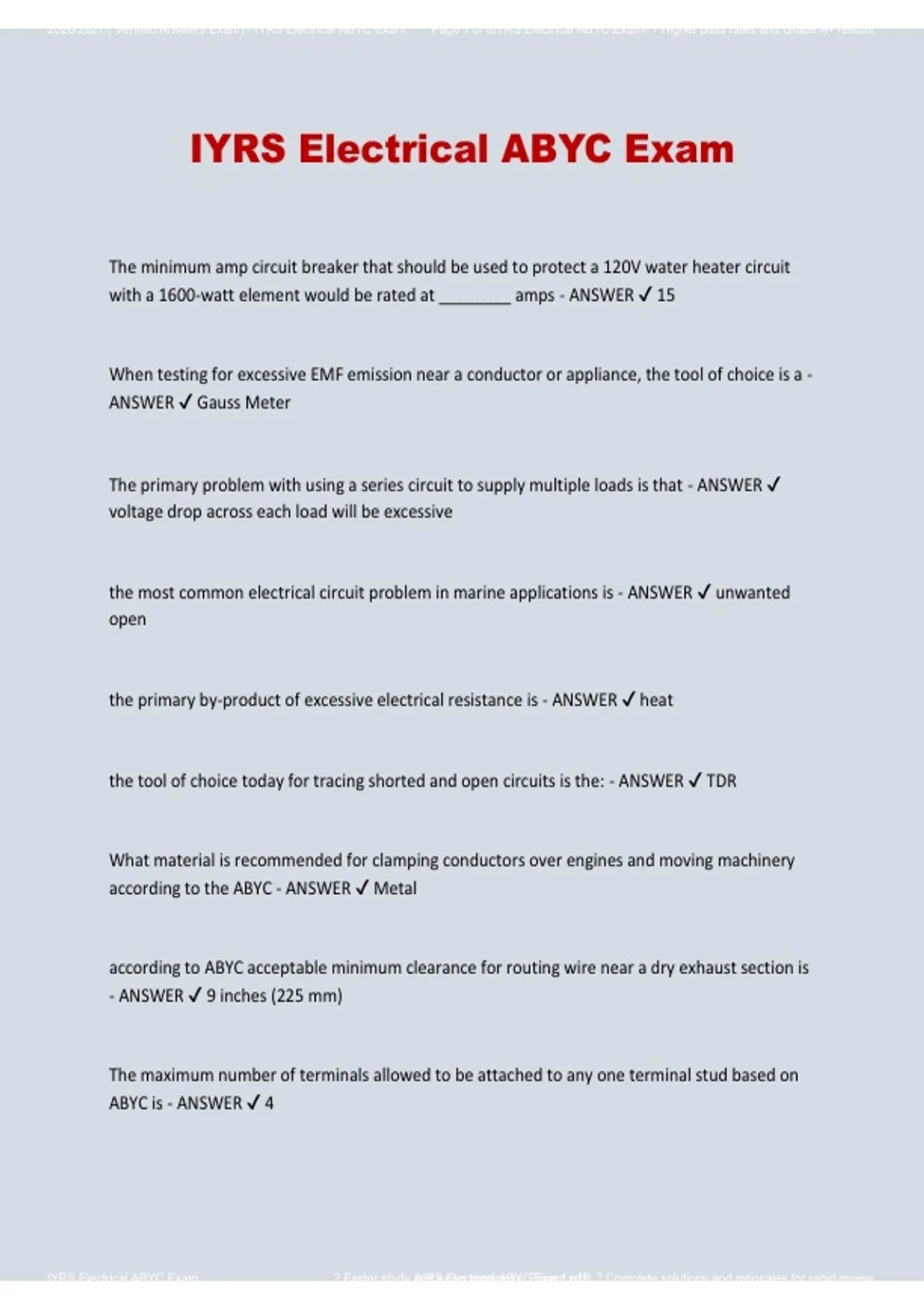 2026/2027:( Verified Answers Exam) - IYRS Electrical ABYC Exam Page 1 of 8IYRS Electrical ABYC Exam- ? Higher pass rates and Grade A+ results.