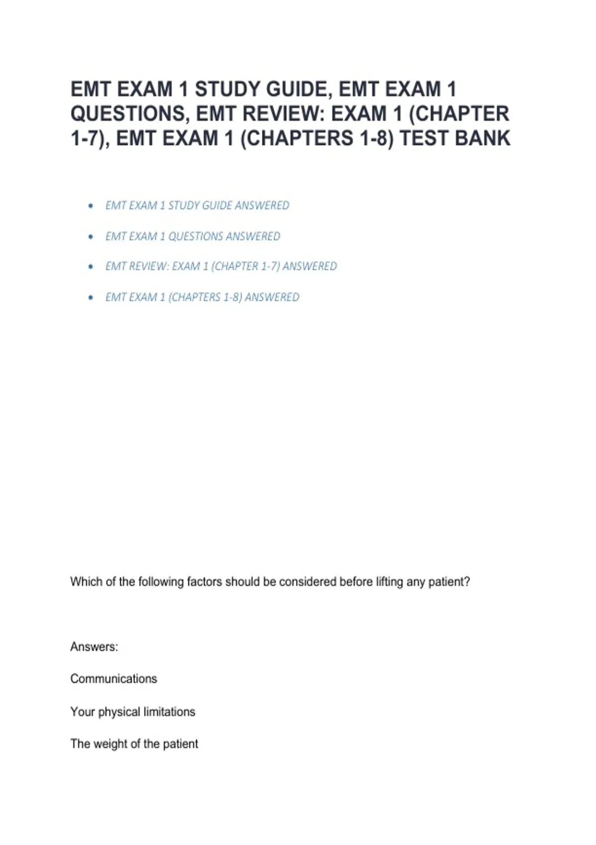 Prepare for EMT Exam 1 (Chapters 1-7) with this 2026/2027 comprehensive study guide. Includes practice questions, detailed answers, and step-by-step explanations to help EMT students master patient assessment, emergency procedures, and clinical decision-making for exam success.