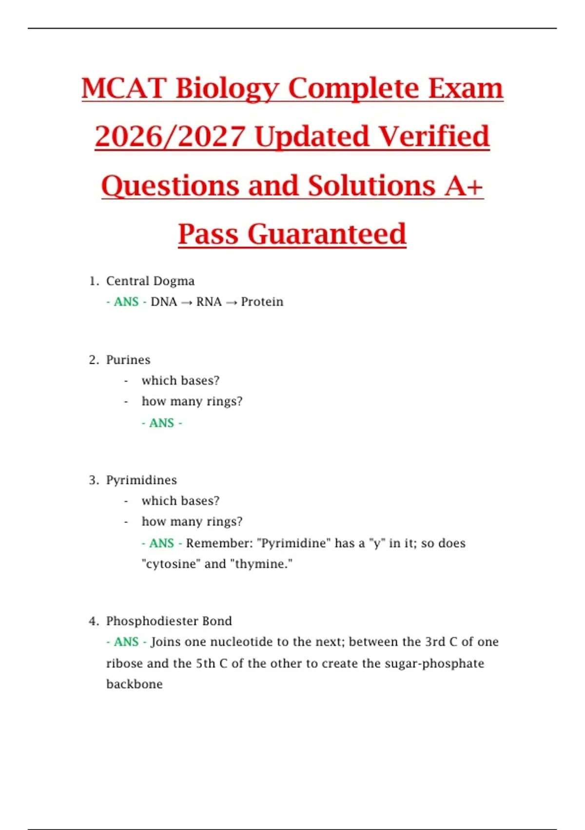 MCAT Biology Complete Exam 2026/2027 Updated Verified Questions and Solutions A+ Pass Guaranteed