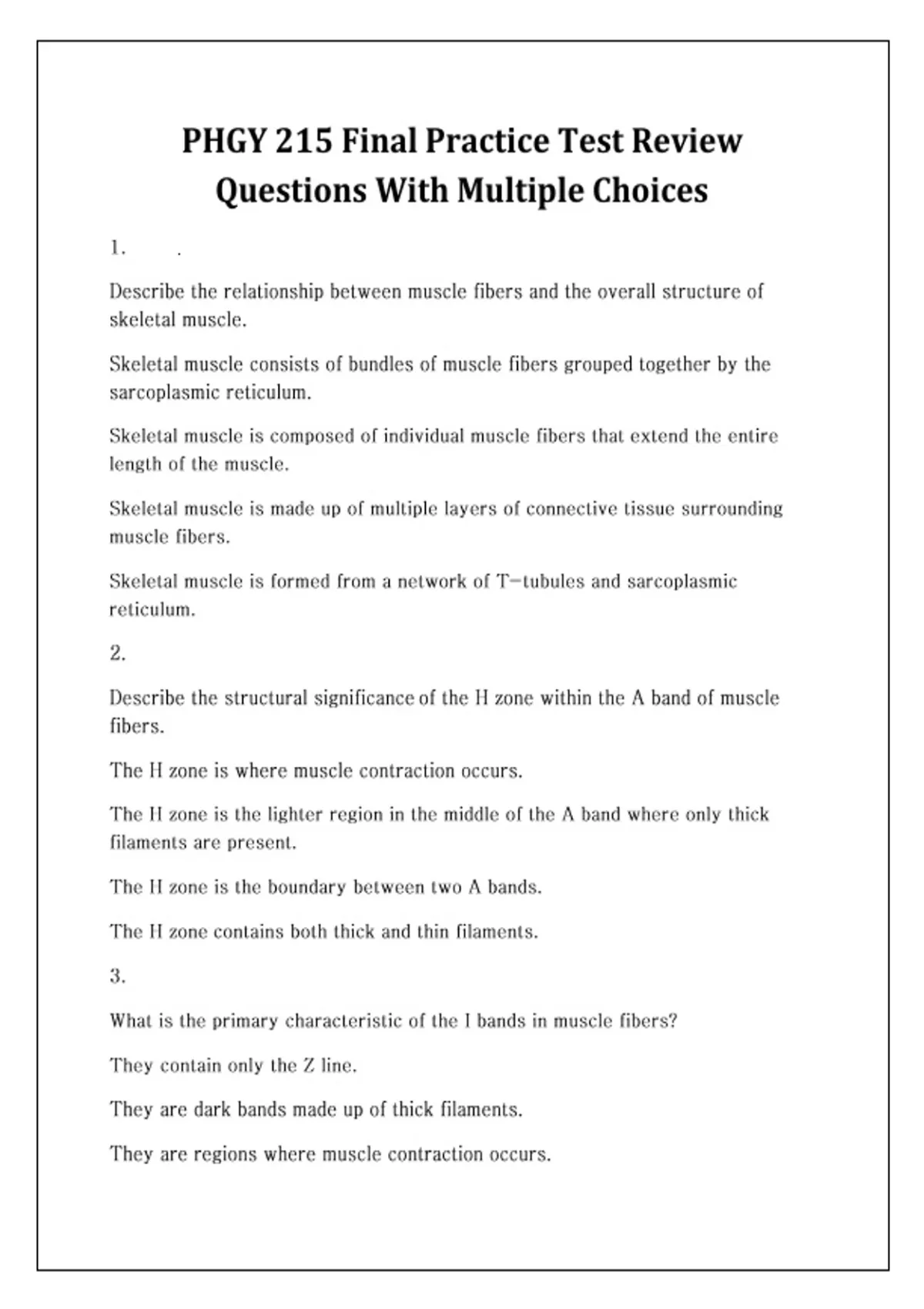 PHGY 215 Final Practice Test Review Questions With Multiple Choices 1. Describe the relationship between muscle fibers and the overall structure of skeletal muscle. Skeletal muscle consists of bundles of muscle fibers grouped together by the sarcoplasmic reticulum. Skeletal muscle is composed of individual muscle fibers that extend the entire length of the muscle. Skeletal muscle is made up of multiple layers of connective tissue surrounding muscle fibers. Skeletal muscle is formed from a network of T-tubules and sarcoplasmic reticulum. 2. Describe the structural significance of the H zone within the A band of muscle fibers. The H zone is where muscle contraction occurs. The H zone is the lighter region in the middle of the A band where only thick filaments are present. The H zone is the boundary between two A bands. The H zone contains both thick and thin filaments. 3. What is the primary characteristic of the I bands in muscle fibers? Continues....