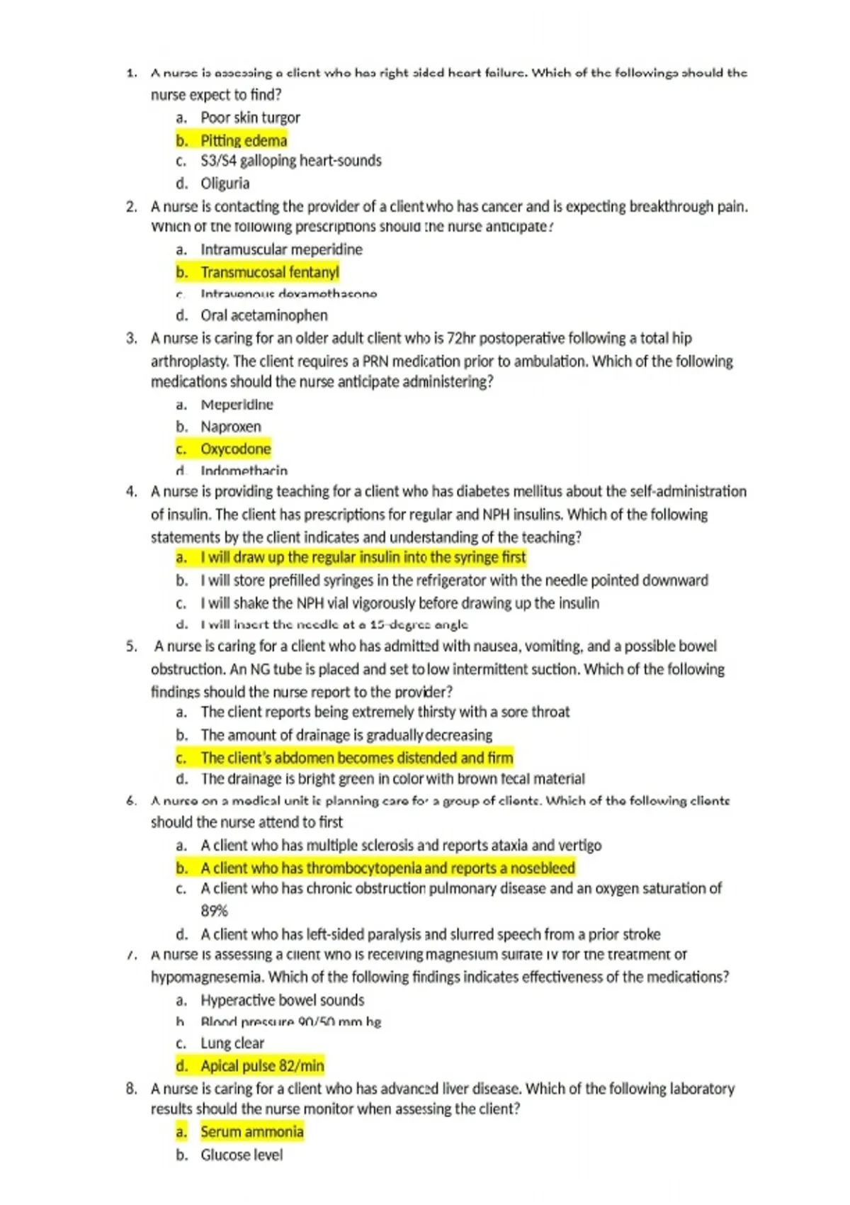 1. A nurse is assessing a client who has right-sided heart failure. Which of the followings should the nurse expect to find? a. Poor skin turgor b. Pitting edema c. S3/S4 galloping heart-sounds d. Oliguria 2. A nurse is contacting the provider of a client who has cancer and is expecting breakthrough pain. Which of the following prescriptions should the nurse anticipate? a. Intramuscular meperidine b. Transmucosal fentanyl c. Intravenous dexamethasone d. Oral acetaminophen 3. A nurse is caring for an older adult client who is 72hr postoperative following a total hip arthroplasty. The client requires a PRN medication prior to ambulation. Which of the following medications should the nurse anticipate administering? a. Meperidine b. Naproxen c. Oxycodone d. Indomethacin 4. A nurse is providing teaching for a client who has diabetes mellitus about the self-administration of insulin. The client has prescriptions for regular and NPH insulins. Which of the following statements by the client indicates and understanding of the teaching? a. I will draw up the regular insulin into the syringe first b. I will store prefilled syringes in the refrigerator with the needle pointed downward c. I will shake the NPH vial vigorously before drawing up the insulin d. I will insert the needle at a 15-degree angle 5. A nurse is caring for a client who has admitted with nausea, vomiting, and a possible bowel obstruction. An NG tube is placed and set to low intermittent suction. Which of the following findings should the nurse report to the provider? a. The client reports being extremely thirsty with a sore throat b. The amount of drainage is gradually decreasing c. The client’s abdomen becomes distended and firm d. The drainage is bright green in color with brown fecal material 6. A nurse on a medical unit is planning care for a group of clients. Which of the following clients should the nurse attend to first a. A client who has multiple sclerosis and reports ataxia and vertigo b. A client who has thrombocytopenia and reports a nosebleed c. A client who has chronic obstruction pulmonary disease and an oxygen saturation of 89% d. A client who has left-sided paralysis and slurred speech from a prior stroke 7. A nurse is assessing a client who is receiving magnesium sulfate IV for the treatment of hypomagnesemia. Which of the following findings indicates effectiveness of the medications? a. Hyperactive bowel sounds b. Blood pressure 90/50 mm hg c. Lung clear d. Apical pulse 82/min 8. A nurse is caring for a client who has advanced liver disease. Which of the following laboratory results should the nurse monitor when assessing the client? a. Serum ammonia b. Glucose level c. Phosphate level d. Serum troponin 9. A nurse is providing instructions about foot care for a client who has peripheral arterial disease. The nurse should identify that which of the following statements by the client indicates an understanding of the teaching? a. I apply a lubricating lotion to the cracked areas on the sole of my feet every morning b. I rest in my recliner with my feet elevated for about an hour every afternoon c. I soak my feet in hot water before trimming my toenails d. I use my heating pad on a low setting to keep my feet warm 10. A nurse is providing teaching to a client who has a DVT. Which of the following findings should the nurse identify as a risk factor for the development of the DVT a. NSAIDs use b. Oral contraceptive use c. HTN d. Cirrhosis 11. A nurse is caring for a client in diabetic ketoacidosis (DKA). Which of the following is the priority intervention by the nurse? a. Check potassium levels b. Administer 0.9% sodium chloride c. Begin bicarbonate continuous IV infusion d. Initiate a continuous IV insulin infusion 12. A nurse is caring for a client who takes Lisinopril for HTN. Which of the following client statements indicates an adverse effect of the medication? a. I have a heightened sense of taste b. I have a nagging, dry cough c. I have to urinate frequently d. I seem to be bruising more easily 13. A nurse is caring for a client who is receiving TPN. Which of the following nursing actions are appropriate? (select all that apply) a. Infuse 0.9% sodium chloride if the solution is not available b. Increase the rate of infusion if administration is delayed c. Monitor serum blood glucose drug infusion d. Verify the solution with another RN prior to infusion e. Obtain the client’s weight daily 14. A home care nurse is planning to use nonpharmacological pain relief measures for an adult client who has severe chronic back pain. Which of the following guidelines should the nurse use? a. D/C opioids before trying nonpharmacological methods of pain relief b. Use imagery with client who have difficulty with focus and concentration c. Pain relief from the use of heat and cold continues for several hours after removal of the stimulus d. Distraction changes the client’s perception of pain, but doesn’t affect the cause 15. A nurse is caring for a client who has an endotracheal tube. Which of the following actions should the nurse take to verify tube placement? a. Deflate the cuff to check the tube placement b. Place the client’s head and neck in a flexed position c. Observe for symmetry of chest expansion d. Document the tube length where it passes the chin 16. A nurse is assessing for positive Chvostek’s sign following a thyroidectomy. Which of the following areas on the client’s head should the nurse tap to assess the client for tetany? a. Front of the ear 17. A nurse is caring for a client who has diabetes insipidus. Which of the following medications should the nurse plan to administer? a. Desmopressin b. Lithium carbonate c. Regular insulin d. Furosemide 18. A nurse is caring for a client who has flail chest. Which of the following actions should the nurse take? a. Implement fluid restriction b. Administer acetaminophen orally c. Provide humidified oxygen d. Administer antibiotic medication 19. A nurse is p
