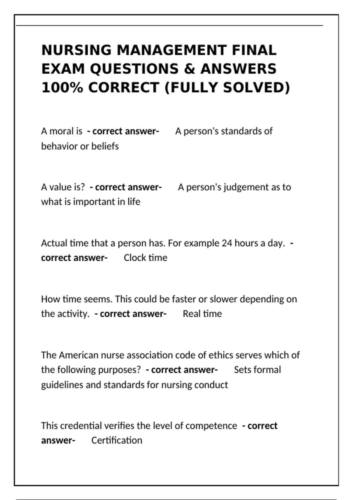 This document contains fully solved final exam questions and answers for the Nursing Management course, covering core topics such as leadership theories, management styles, ethics, delegation, time management, and professional nursing roles. It is designed as a comprehensive exam preparation resource, with clearly marked correct answers to support effective studying and review. The material is suitable for students preparing for final assessments in nursing management courses.
