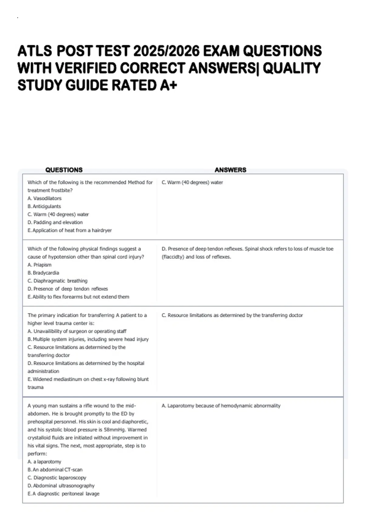 This high-quality 40-page study guide delivers the latest 2025/2026 ATLS (Advanced Trauma Life Support) post-test with real exam questions and 100% verified correct answers based on the current ATLS 10th edition principles. Designed for trauma surgeons, emergency physicians, residents, nurses, paramedics, and anyone preparing for the ATLS written exam or recertification, it covers critical scenarios from the primary survey through definitive care, emphasizing rapid assessment, life-threatening conditions, and decision-making under pressure.