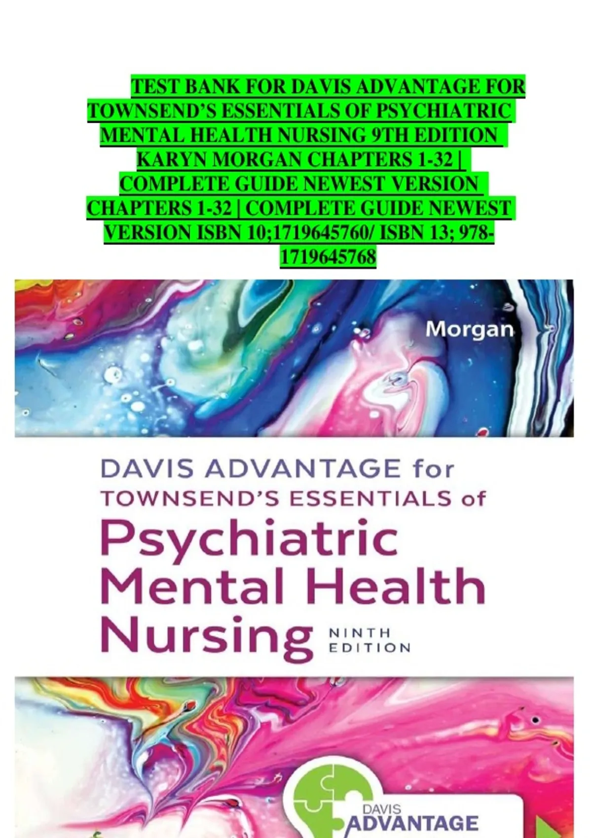 This document offers a complete test bank for Davis Advantage for Townsend’s Essentials of Psychiatric Mental Health Nursing, 9th Edition by Karyn Morgan, covering chapters 1 through 32. It serves as a comprehensive study and exam-preparation guide aligned with the newest version of the textbook.