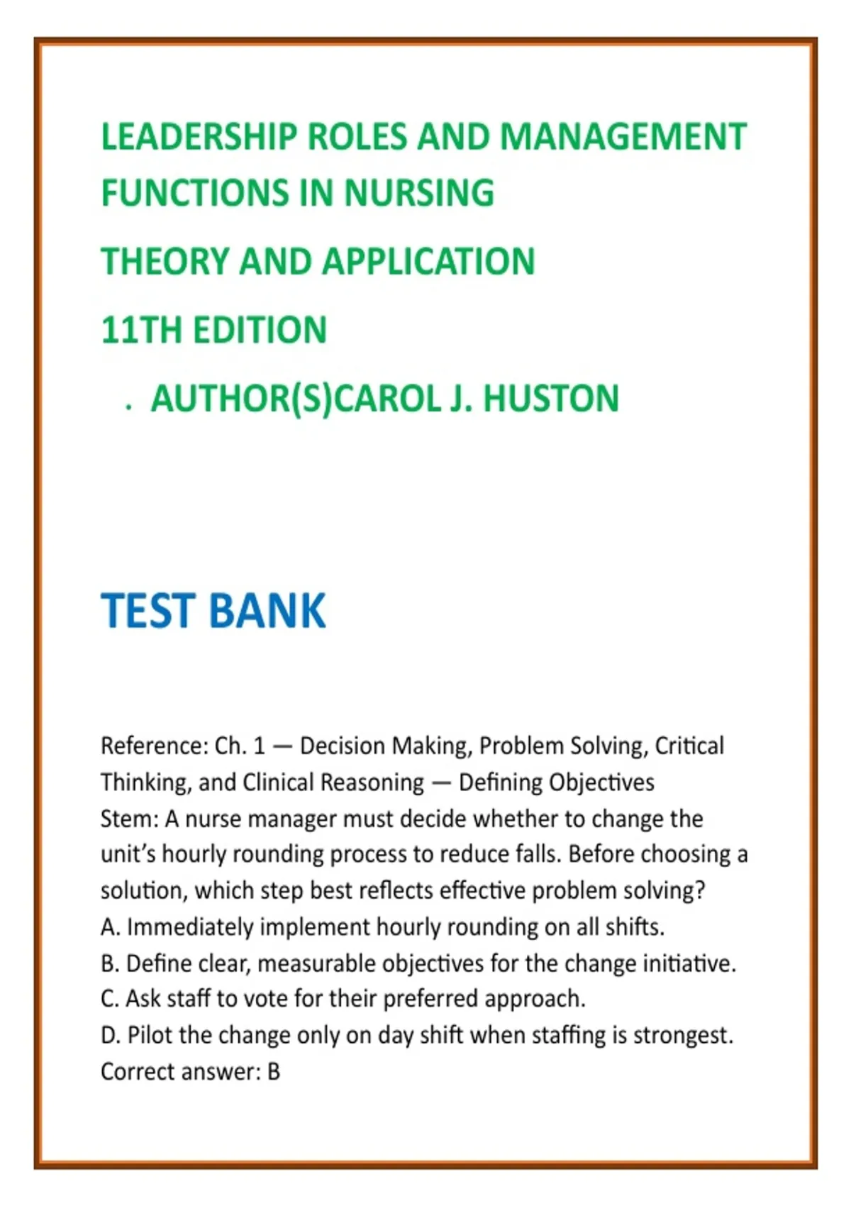 Leadership Roles & Management Functions in Nursing Test Bank 2026 | Huston 11th Ed | 50 MCQs per Chapter Description: Master nursing leadership and management with this comprehensive Nursing Leadership & Management Test Bank based on Leadership Roles and Management Functions in Nursing: Theory and Application (11th Edition) by Carol J. Huston—one of the most trusted and widely adopted authorities in nursing leadership education. This digital test bank provides FULL textbook coverage of all units and chapters, with 50 NCLEX-style multiple-choice questions (MCQs) per chapter, each paired with clear, evidence-based rationales. Every question is written to reflect real-world leadership and management scenarios faced by charge nurses, nurse managers, and emerging nurse leaders. Designed to strengthen clinical judgment, delegation, prioritization, and systems-level thinking, this resource prepares learners for leadership-focused exams while reinforcing the application of management theory in practice. Scenarios address staffing decisions, workforce challenges, conflict resolution, ethical and legal accountability, quality improvement, and patient safety leadership—mirroring expectations in BSN, RN-to-BSN, and MSN-level coursework. Key benefits include: Significant time savings with exam-focused, chapter-aligned practice Increased confidence in leadership and management decision-making Stronger understanding of delegation, staffing, and organizational leadership Improved readiness for NCLEX-style and course-based leadership exams Ideal for courses in: Nursing Leadership & Management Nursing Administration Professional Nursing Practice Healthcare Systems & Policy RN-to-BSN and BSN Capstone Leadership MSN Leadership and Management Foundations Product Features: Full coverage of all chapters (11th Edition) 50 high-quality NCLEX-style MCQs per chapter Verified correct answers with detailed rationales Leadership, management, and administrative focus Digital, instant-download study resource Built on Carol J. Huston’s evidence-based leadership frameworks, this test bank is a powerful tool for exam success and professional leadership readiness. Keywords: nursing leadership test bank nursing management MCQs Huston leadership nursing test bank leadership roles nursing MCQs nursing administration exam questions nursing test bank 2026 nursing management study guide RN to BSN leadership test bank Hashtags: #NursingLeadership #NursingManagement #NursingTestBank #HustonNursing #NursingAdministration #RNtoBSN #BSNLeadership #MSNLeadership #NCLEXStyleQuestions #NursingEducation