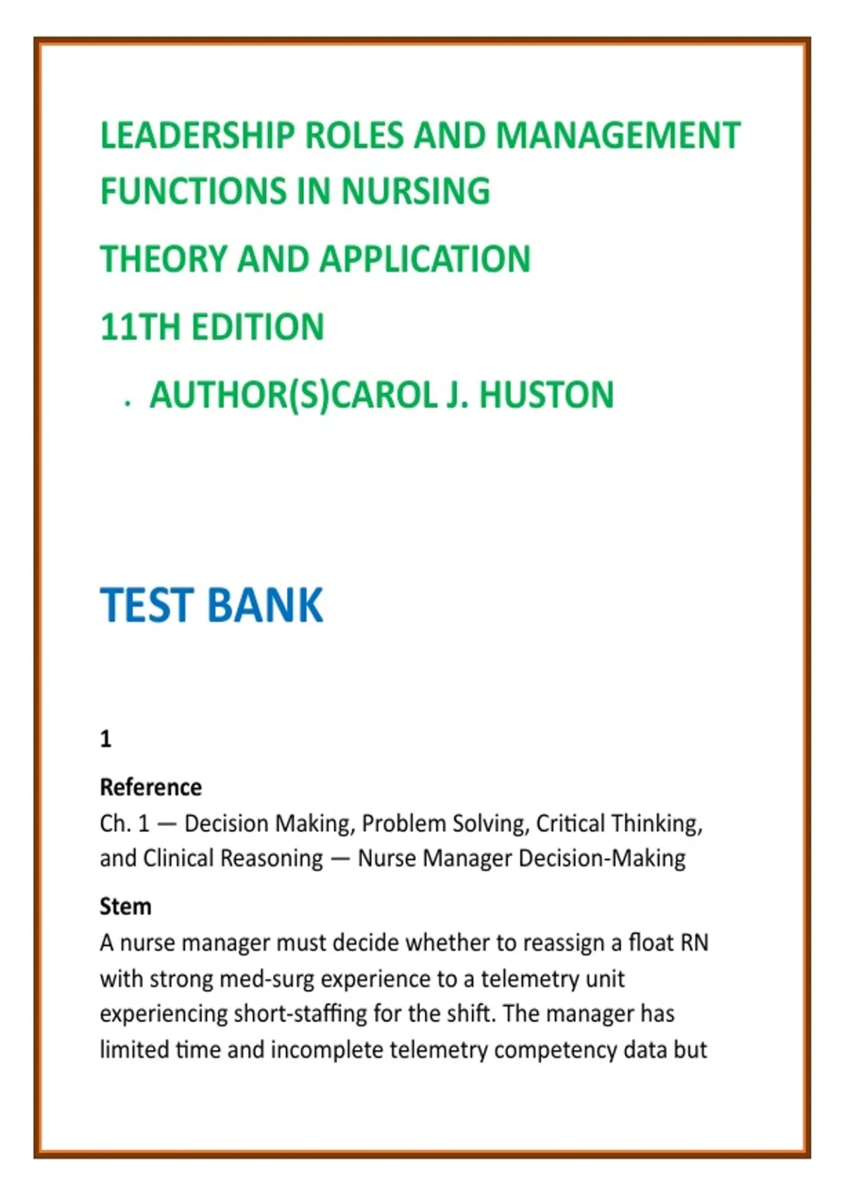 Leadership Roles & Management Functions in Nursing 11th Ed Test Bank | Huston Nursing Leadership MCQs 2026 Description: Master nursing leadership and management decision-making with this comprehensive, exam-focused Test Bank for Leadership Roles and Management Functions in Nursing: Theory and Application (11th Edition) by Carol J. Huston. Designed for today’s nursing students and emerging nurse leaders, this digital product delivers full textbook coverage with 50 high-quality NCLEX-style MCQs per chapter, aligned to leadership-level clinical reasoning and management judgment. Each question goes beyond recall, requiring application, analysis, and evaluation in realistic nurse manager, charge nurse, and organizational leadership scenarios. Detailed, evidence-based rationales reinforce delegation, prioritization, staffing, ethical decision-making, and systems thinking, preparing learners for leadership-focused exams and real-world nursing administration roles. This test bank is ideal for time-efficient, confidence-building exam preparation, helping students strengthen professional judgment while integrating Carol J. Huston’s widely adopted leadership frameworks. Whether preparing for course exams, RN-to-BSN advancement, or MSN leadership foundations, this resource supports safe, effective, and ethical nursing leadership practice. What’s included: Full coverage of ALL units and chapters from Huston’s 11th Edition 50 NCLEX-style MCQs per chapter (high-discrimination, leadership-level) Correct answers with clear, evidence-based rationales Scenarios focused on delegation, staffing, conflict resolution, ethics, quality, and patient safety Designed for Nursing Leadership & Management, Administration, Professional Practice, and Healthcare Systems courses Trusted by nursing programs nationwide, this test bank is a practical, exam-ready tool for developing confident, competent nurse leaders. Keywords: nursing leadership test bank Huston nursing management test bank leadership roles nursing MCQs nursing management MCQs nursing test bank 2026 nursing administration exam questions RN to BSN leadership test bank MSN leadership nursing test bank Hashtags: #NursingLeadershipTestBank #NursingManagementMCQs #HustonNursing #NursingAdministration #RNtoBSNLeadership #MSNLeadership #NursingExamPrep #NursingFacultyResources #ProfessionalNursingPractice #HealthcareLeadership