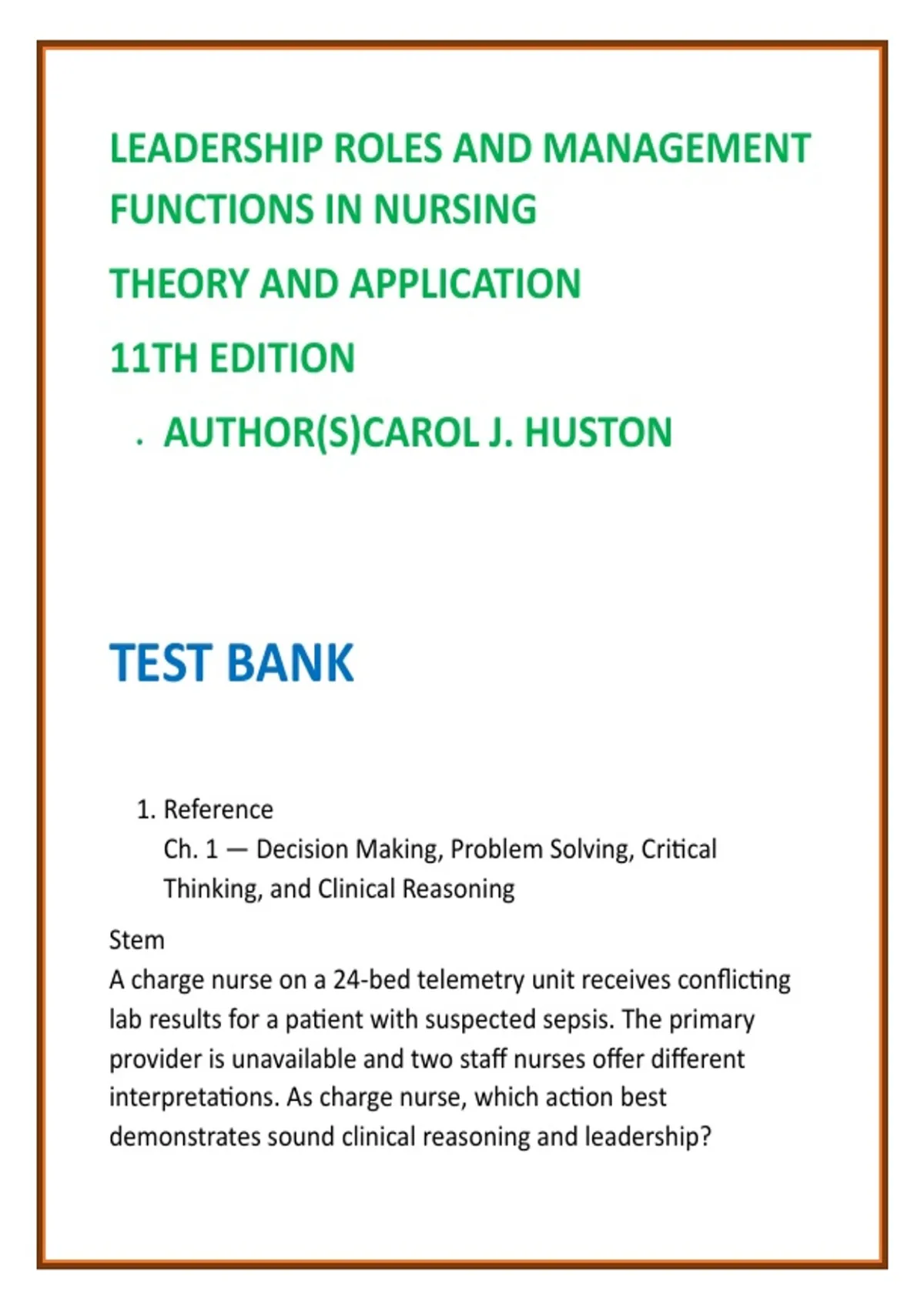 Leadership Roles & Management Functions in Nursing 11th Ed Test Bank 2026 | Huston Nursing Leadership MCQs Description: Advance your nursing leadership and management expertise with this comprehensive digital test bank built exclusively from Leadership Roles and Management Functions in Nursing: Theory and Application, 11th Edition by Carol J. Huston—a trusted authority in nursing leadership education. Designed for today’s BSN, RN-to-BSN, and MSN learners, this resource delivers 50 high-quality NCLEX-style MCQs per chapter that go beyond recall and challenge you to apply leadership theory, management frameworks, and ethical decision-making in realistic clinical and administrative scenarios. Each question includes detailed, evidence-based rationales to strengthen critical thinking, clinical judgment, and professional accountability. Whether you’re preparing for course exams, leadership practicums, or transitioning into a charge nurse, nurse manager, or administrative role, this test bank helps you build confidence in delegation, prioritization, staffing, conflict resolution, quality improvement, and patient safety leadership. Perfect for courses in: Nursing Leadership & Management, Nursing Administration, Professional Nursing Practice, Healthcare Systems & Policy, BSN Capstone Leadership, and MSN Foundations in Leadership & Management. Key Features: • FULL textbook coverage — all units and chapters • 50 NCLEX-style MCQs per chapter with verified rationales • Leadership-focused clinical reasoning and management scenarios • Delegation, staffing, ethics, legal standards, and quality improvement emphasis • Time-saving digital format for fast, targeted exam prep • Ideal for undergraduate and graduate nursing leadership pathways Equip yourself with a professional-grade study tool that reflects real-world nursing leadership challenges and supports exam success—backed by Huston’s widely adopted leadership and management frameworks. Keywords: nursing leadership test bank Huston nursing management study guide leadership roles nursing MCQs nursing management exam questions BSN MSN leadership practice test nursing administration test bank NCLEX leadership MCQs nursing systems leadership study pack Hashtags: #NursingLeadership #NursingManagement #HustonTestBank #BSNLeadership #MSNNursing #NursingAdministration #NCLEXPrep #NursingStudents #LeadershipMCQs #StudyNursing