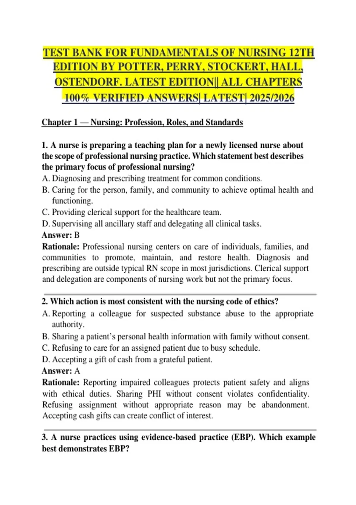 Test Bank – Fundamentals of Nursing 12th Edition – Potter, Perry, Stockert, Hall, Ostendorf – All Chapters, Verified 2025/2026