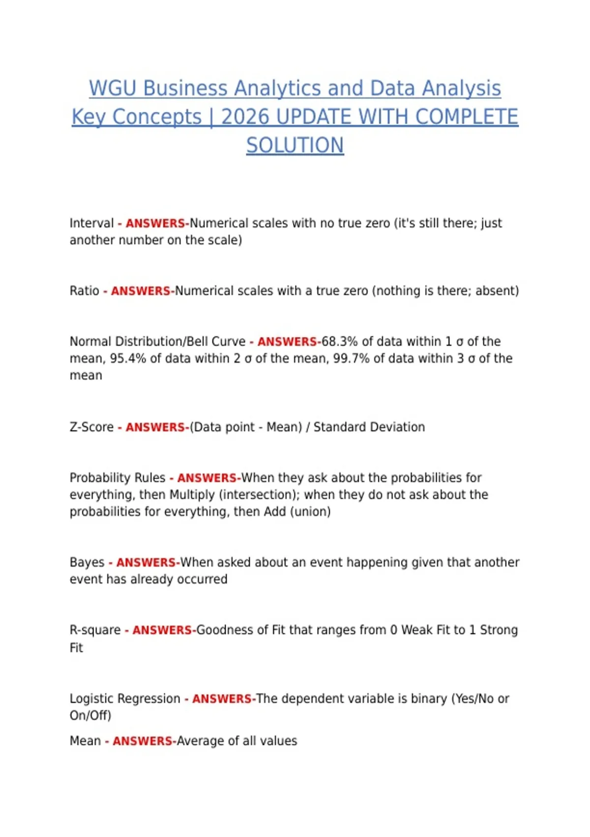 Updated 2026 comprehensive guide for WGU Business Analytics and Data Analysis, covering all key concepts, methodologies, and practical examples. Includes step-by-step solutions and explanations to support students in understanding data-driven decision-making, analysis techniques, and course requirements.