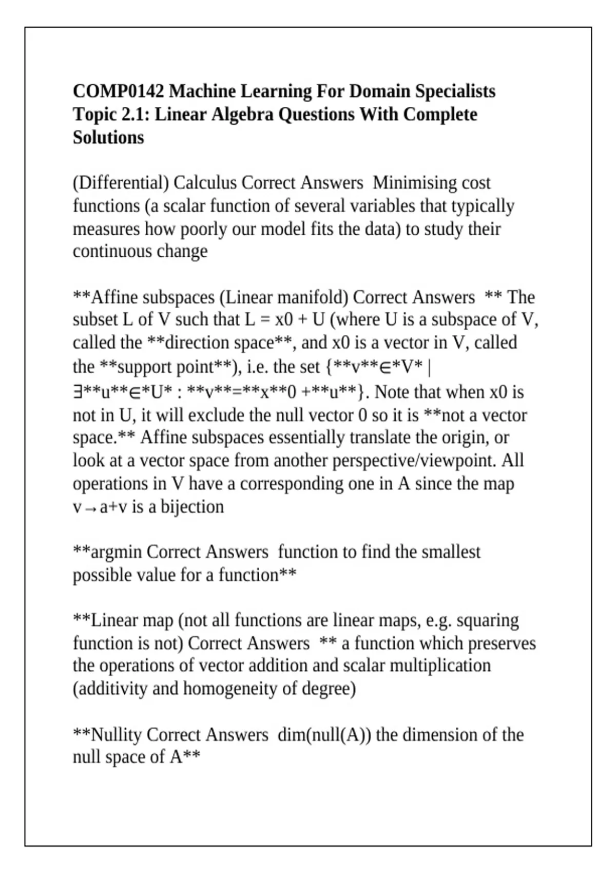 COMP0142 Machine Learning For Domain Specialists Topic 2.1: Linear Algebra Questions With Complete Solutions